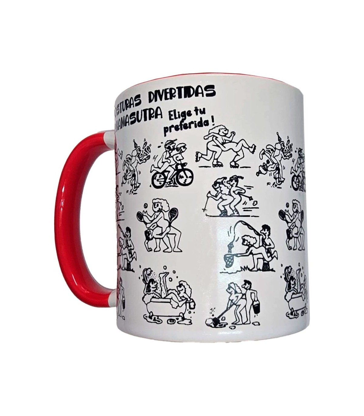 Fabricada en cerámica de alta calidad, esta taza presenta un acabado blanco brillante en el exterior, decorado con divertidos dibujos eróticos inspirados en posturas de kamasutra. Su asa e interior en color rojo intenso le aportan un toque elegante y contrastante, ideal para quienes disfrutan de los detalles con personalidad.