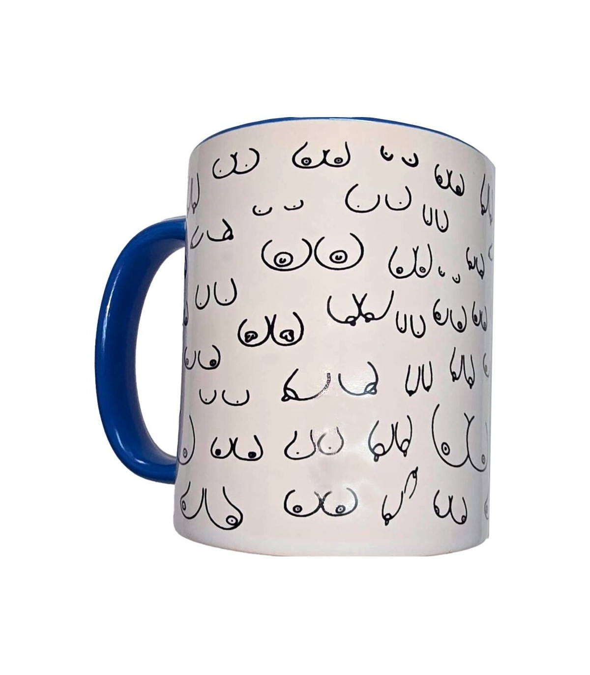 Fabricada en cerámica de alta calidad, esta taza presenta un acabado blanco brillante en el exterior, decorado con divertidos dibujos eróticos inspirados en formas de tetas. Su asa e interior en color azul intenso le aportan un toque elegante y contrastante, ideal para quienes disfrutan de los detalles con personalidad.