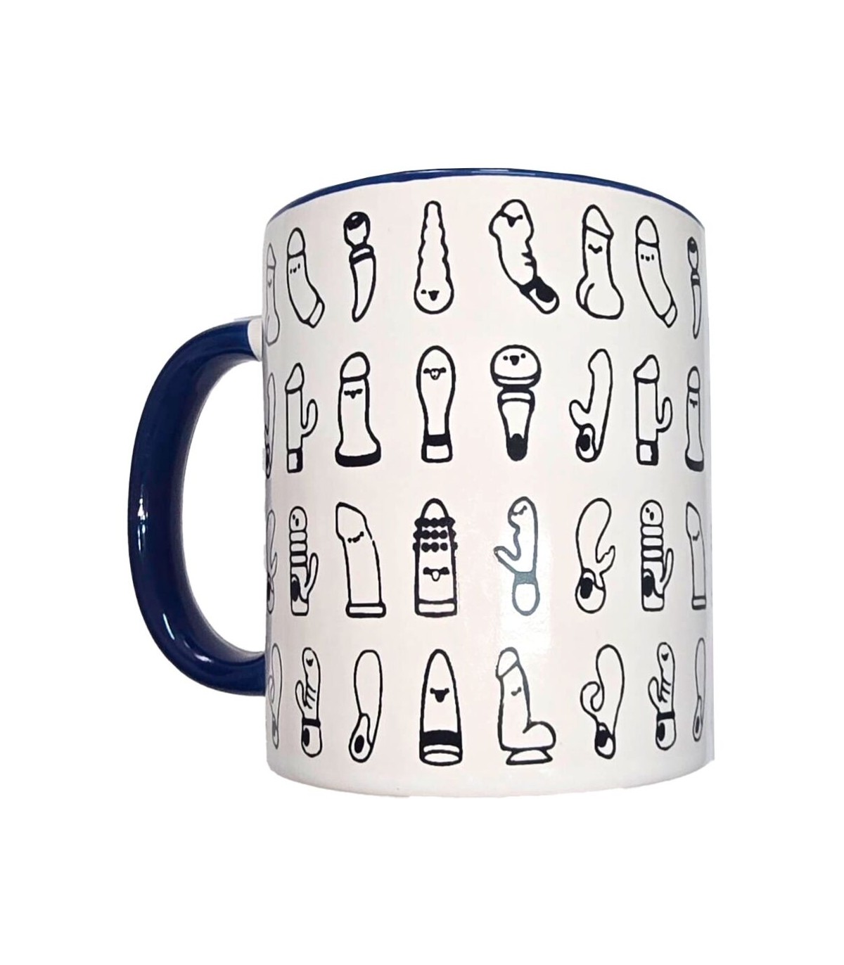 Fabricada en cerámica de alta calidad, esta taza presenta un acabado blanco brillante en el exterior, decorado con divertidos dibujos eróticos inspirados en vibradores. Su asa e interior en color azul intenso le aportan un toque elegante y contrastante, ideal para quienes disfrutan de los detalles con personalidad.