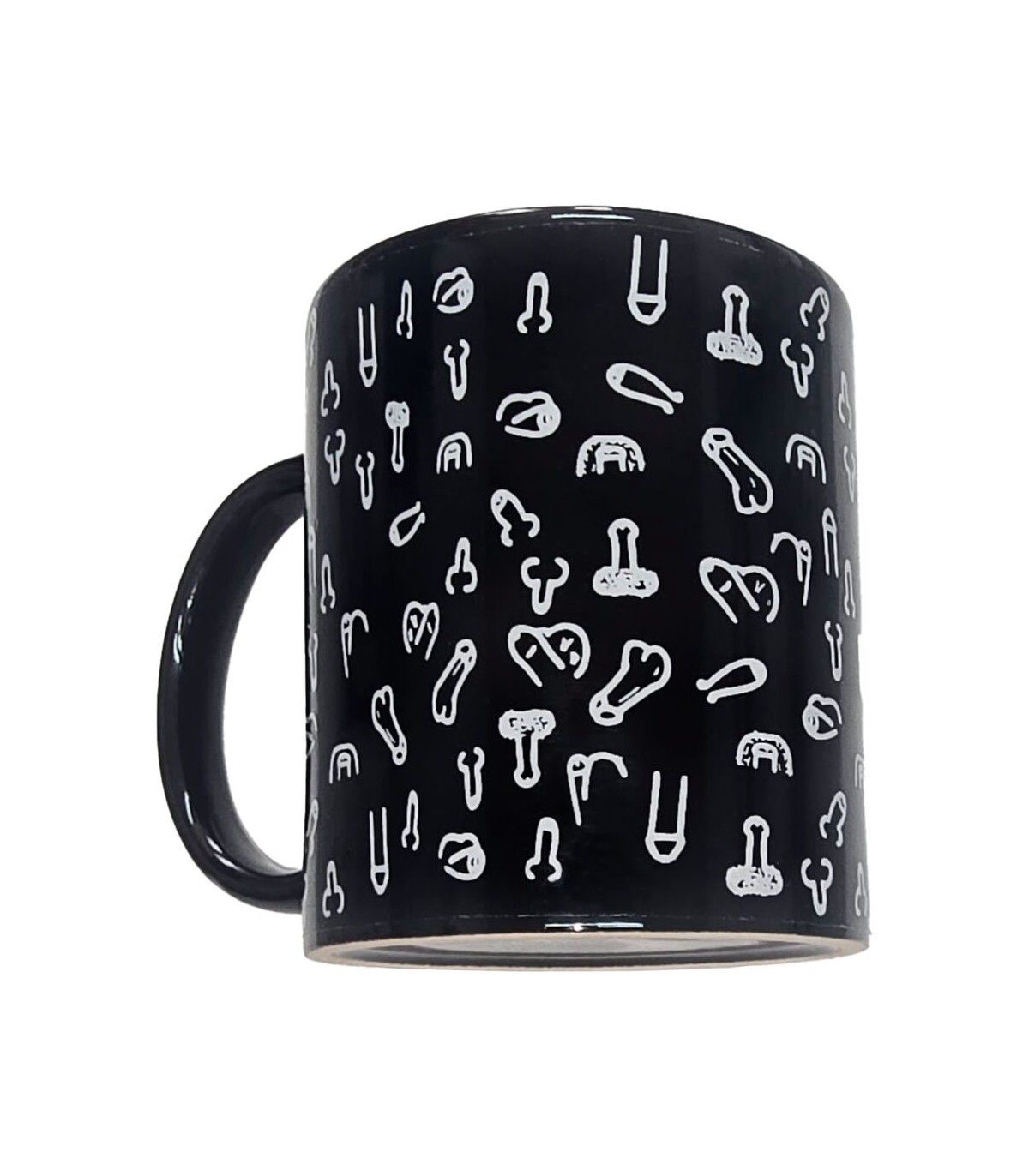 Fabricada en cerámica de alta calidad, esta taza presenta un acabado negro, decorado con divertidos dibujos eróticos inspirados en formas de penes, su asa le aportan un toque elegante y contrastante, ideal para quienes disfrutan de los detalles con personalidad.