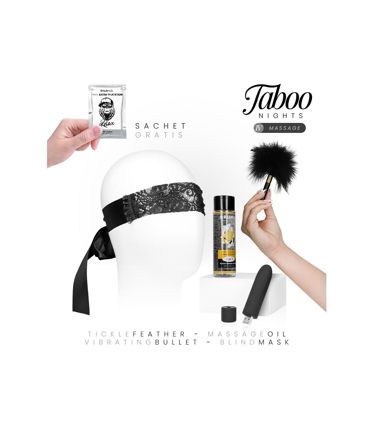 TABOO NIGHTS – 4: MASSAGE es un pack diseñado para despertar los sentidos a través del masaje, el contacto y la estimulación suave. Ideal para crear un ambiente relajante y sensual, combina calor, texturas y placer para disfrutar en pareja.