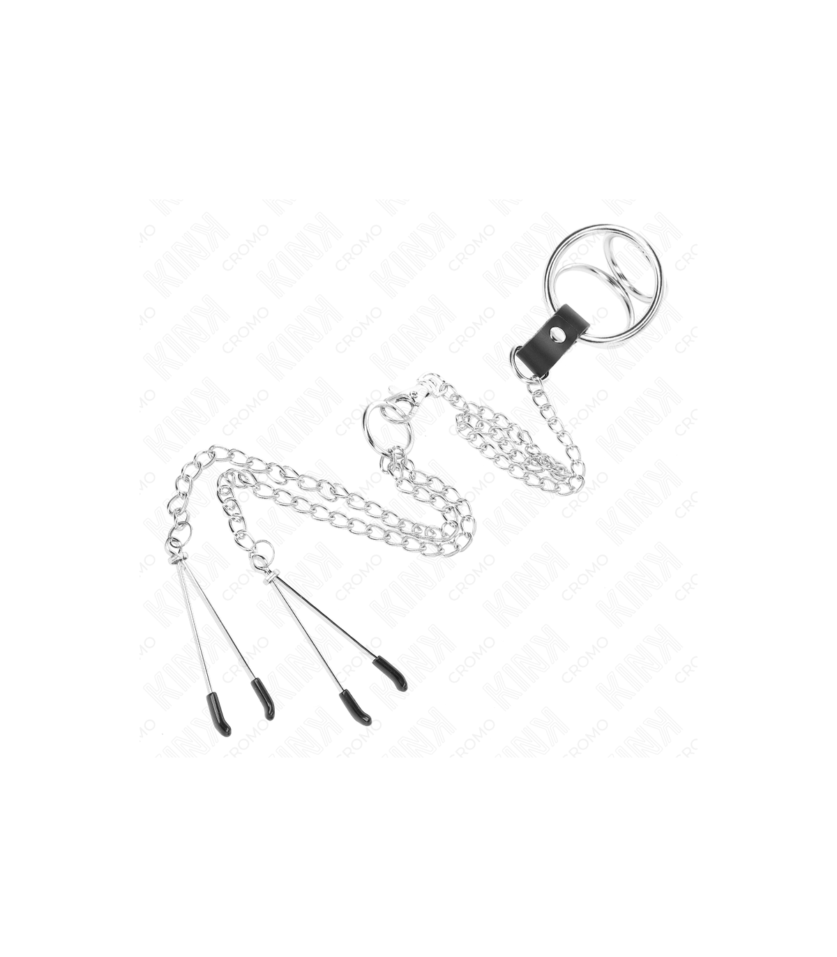 KINK - ANILLO PENE TRIPLE METAL CROMADO 3 CM A 4.5 CM CON CADENA METAL 26 CM Y PINZAS PARA PEZONES