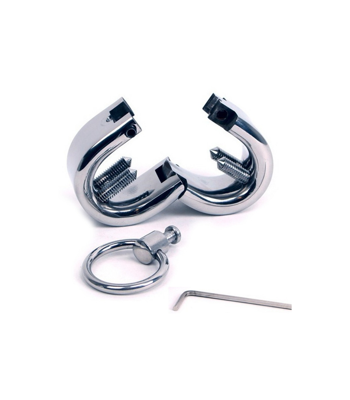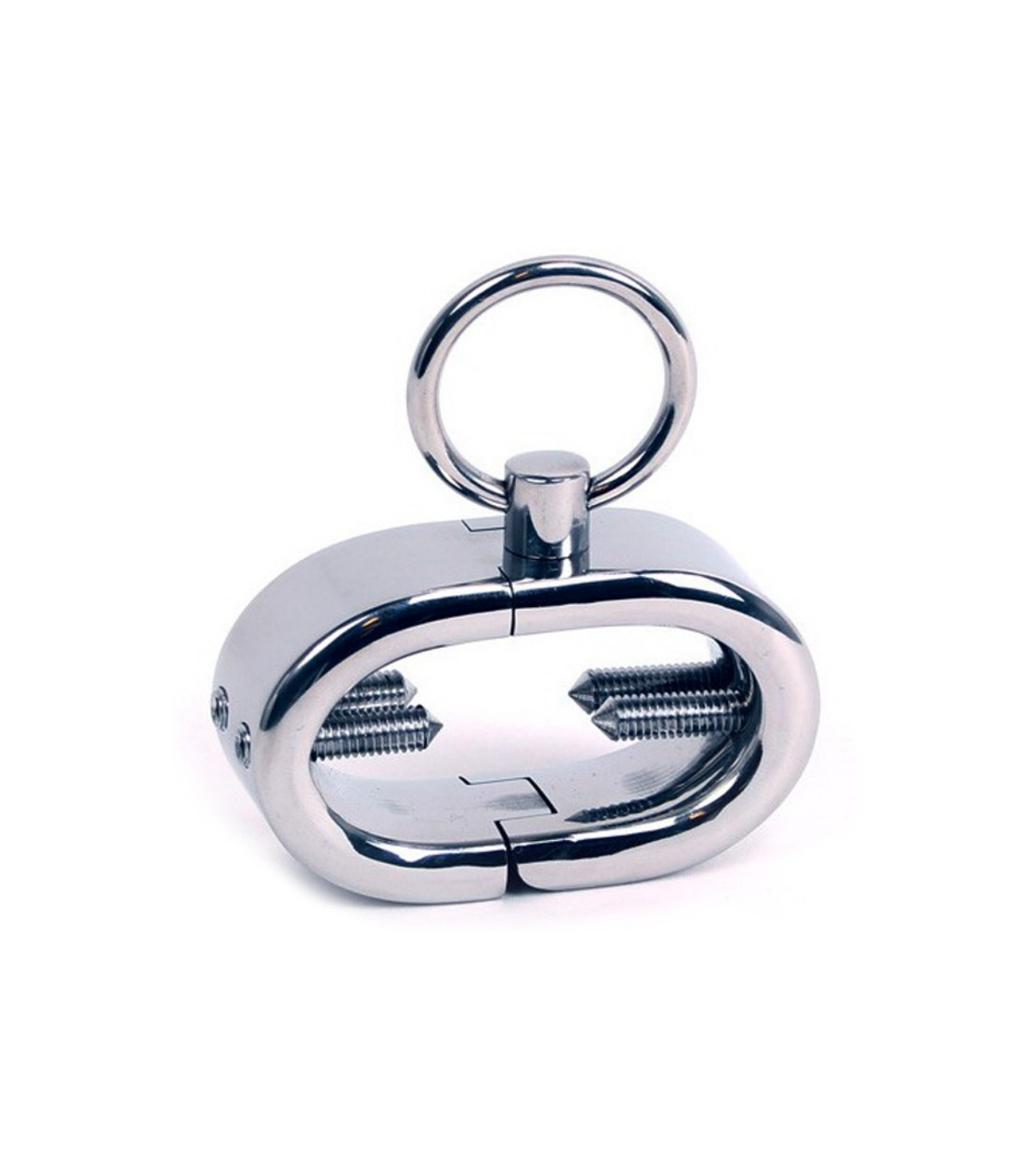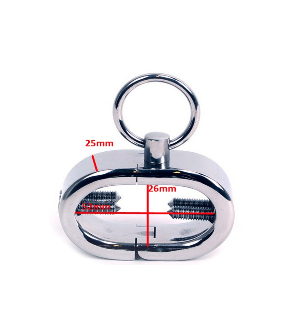 Brazalete de metal para testículos de forma ovalada diseñada para que se ajuste perfectamente alrededor del escroto entre la base del pene y los testículos. Con cuatro tornillos para ejercer presión que se pueden ajustar con la llave allen incluída y con anilla para adjuntar y completar a otros juegos fetiches.