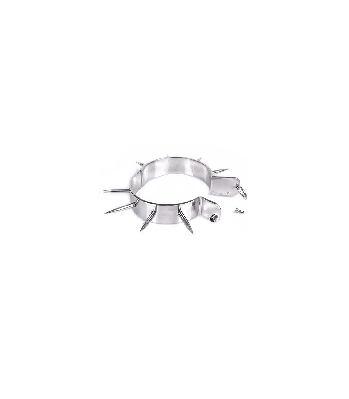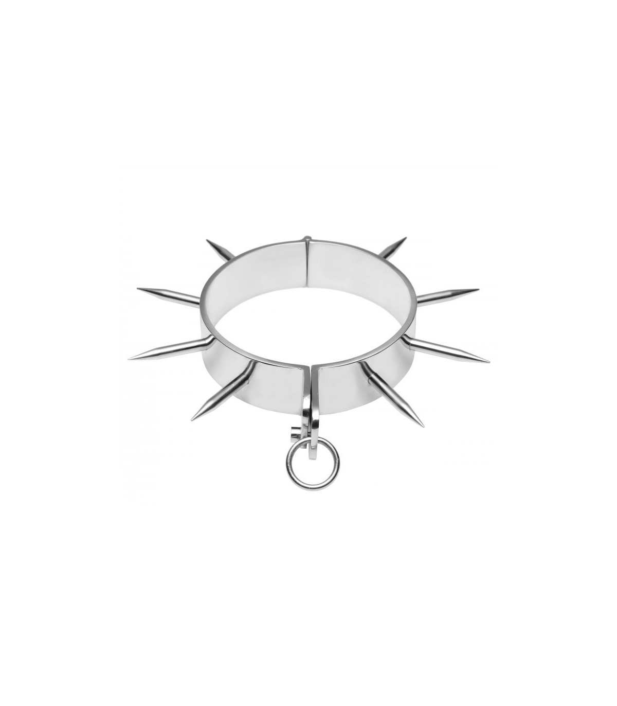 Este collar de metal cromado se cierra con una llave allen incluida. Tiene un acabado brillante con puntas punzantes. El collar tiene una anilla en O para enganchar una cadena con mosquetón, una cuerda o cualquier otro artículo de bondage.