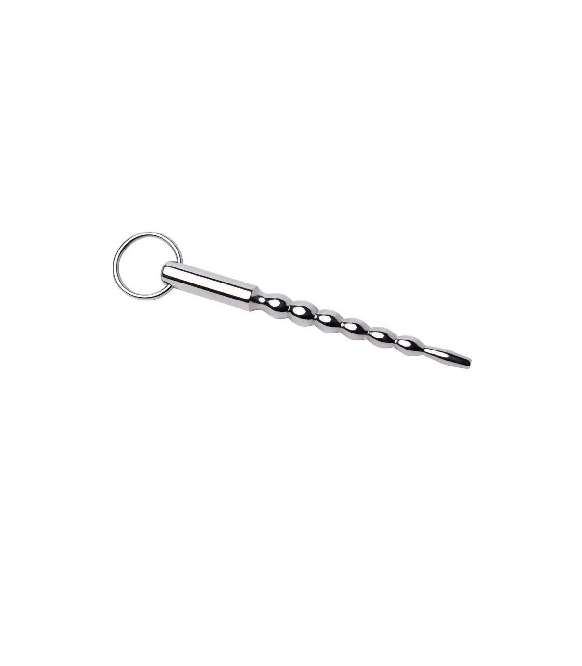 Dilatador de uretra hasta 7mm con bolitas y punta curvada, fabricado en una sola pieza de acero inoxidable.