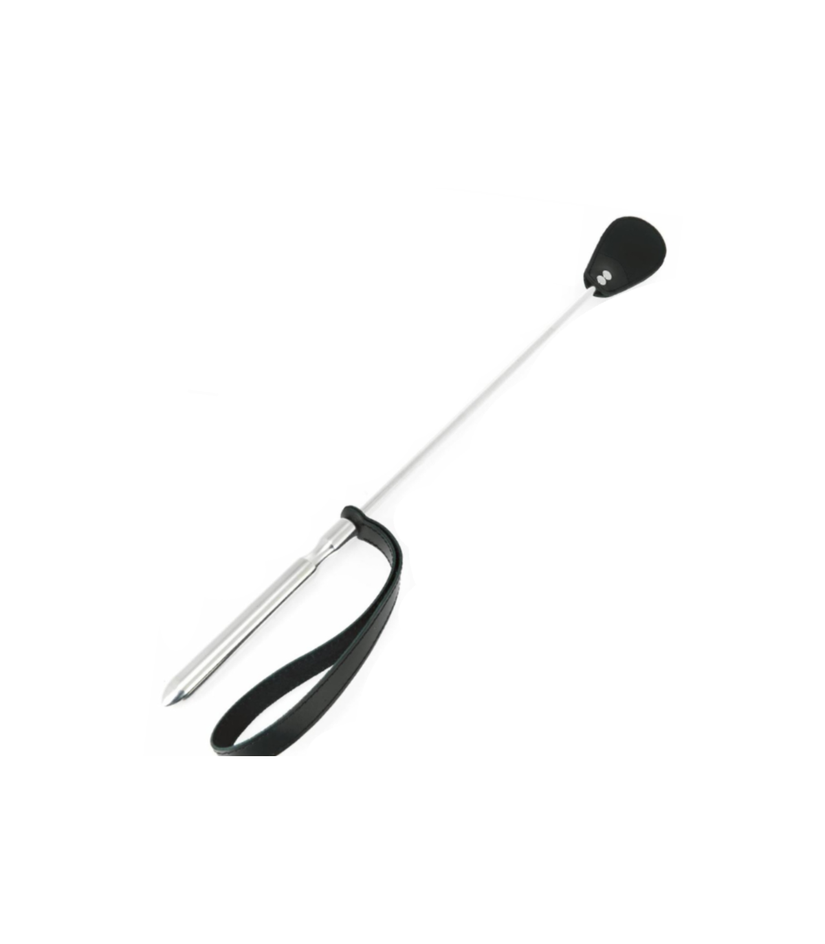 Hermosa fusta de montar de acero inoxidable pulido con doble cuero en el extremo, perfecta para jugar. Con punta de cuero ovalada, es un verdadero imprescindible para el maestro y la amante.