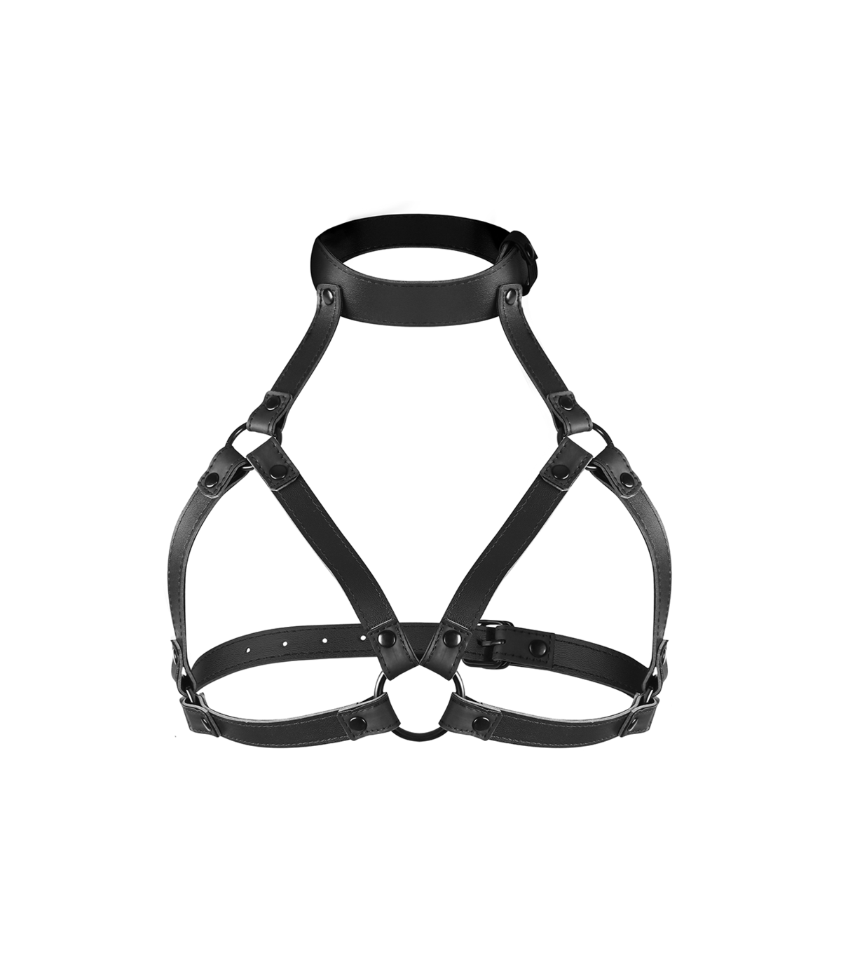 Confeccionado con cuero vegano, neopreno y una cadena de metal, este arnés combina estilo, confort y resistencia. Los enganches resistentes garantizan un agarre seguro, mientras que el diseño ajustable permite una adaptación personalizada.