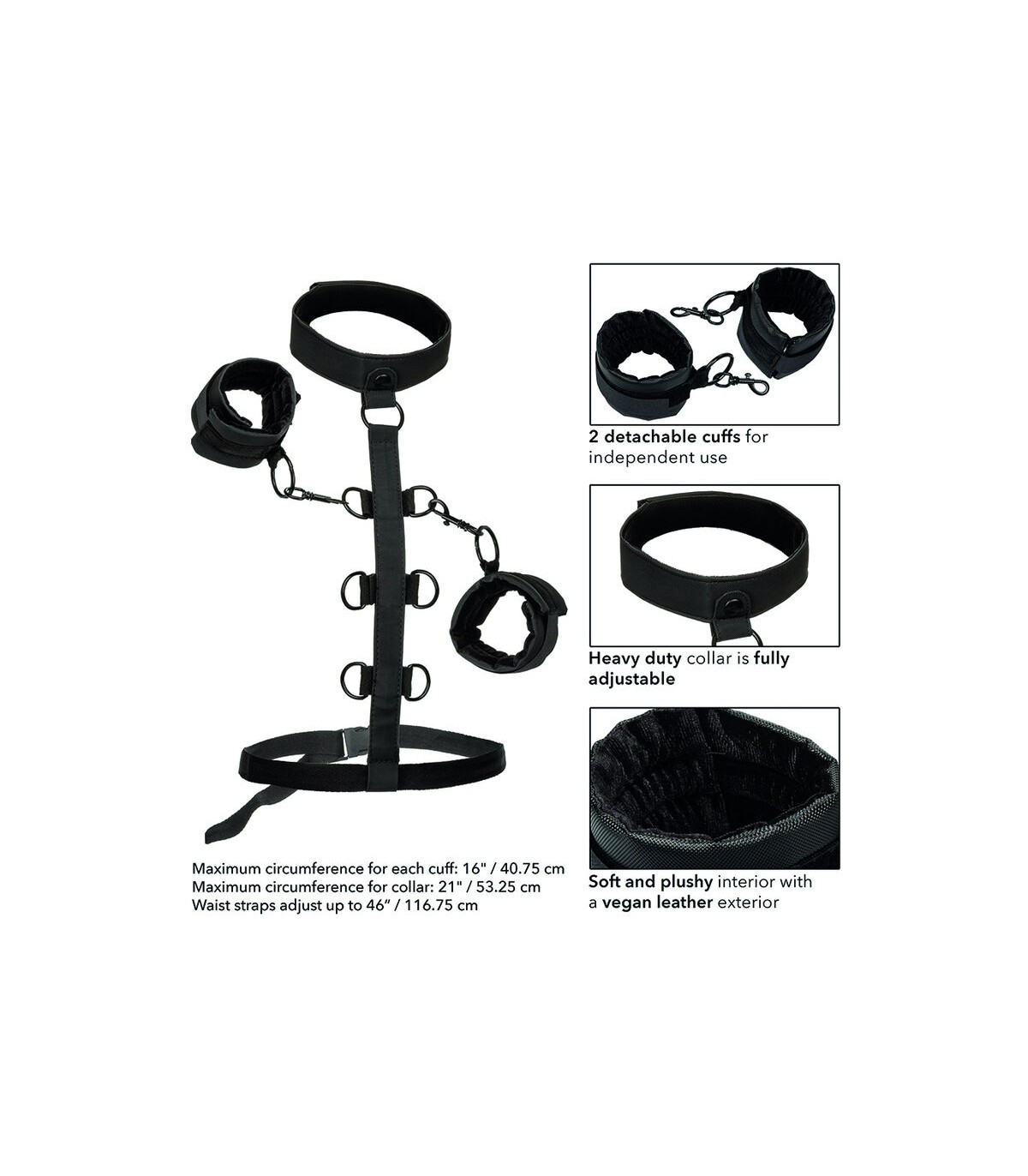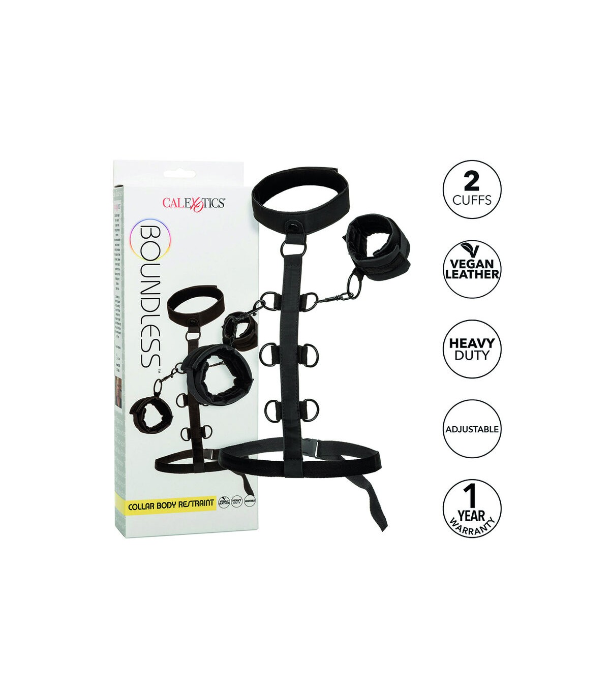 Amplíe los límites del placer y disfrute de infinitas posibilidades de bondage con el sistema de sujeción corporal CalExotics Boundless Collar. Ponte este atrevido sistema de sujeción y explora el juego apasionado con los puños universales de cuero vegano, el cuello resistente y la correa de sujeción de varios niveles. Tanto los fetichistas como los principiantes tímidos pueden disfrutar de un apasionado juego de placer deslizándose en las sujeciones perversamente sexys y los puños acolchados de cuero sintético. Una vez que hayas envuelto este hermoso collar pecaminoso alrededor de tu cuello, tu dominante se deleitará en usar los múltiples niveles de restricciones para comandar y controlar tu placer. Los puños de cuero vegano de felpa están equipados con un cierre universal de alta resistencia con un diseño giratorio para brindarle a su placer un rango completo de movimiento. Además, los puños desmontables se pueden usar de forma independiente para más aventuras. Incluso a los más nuevos en el juego sumiso les encantará la emocionante comodidad de la lujosa capa interior del cuello y el diseño de doble acolchado y doble costura del puño. Haz realidad tus sueños más eróticos y sumérgete en tus deseos más aventureros con este collar de sujeción corporal sensacionalmente cómodo.