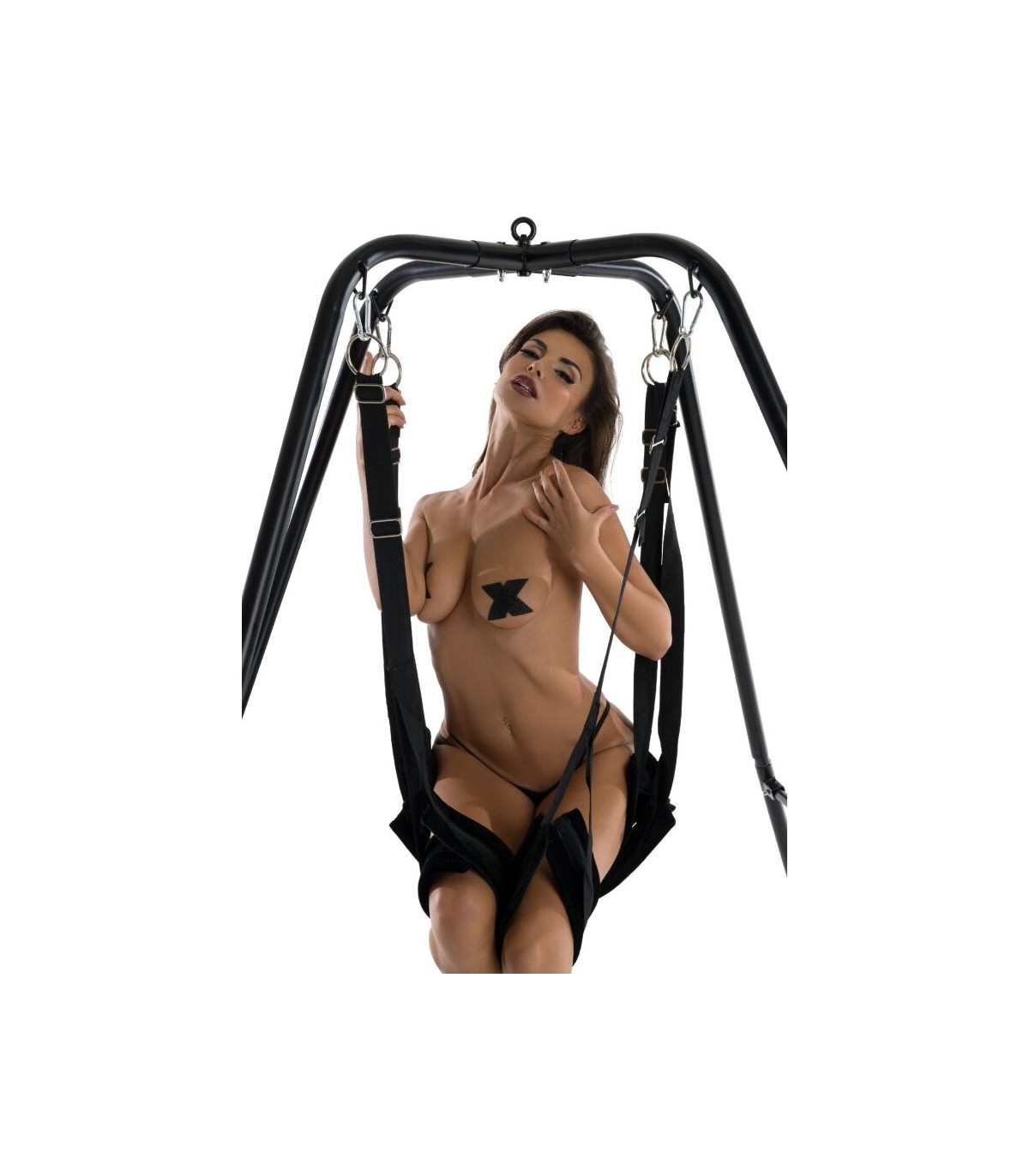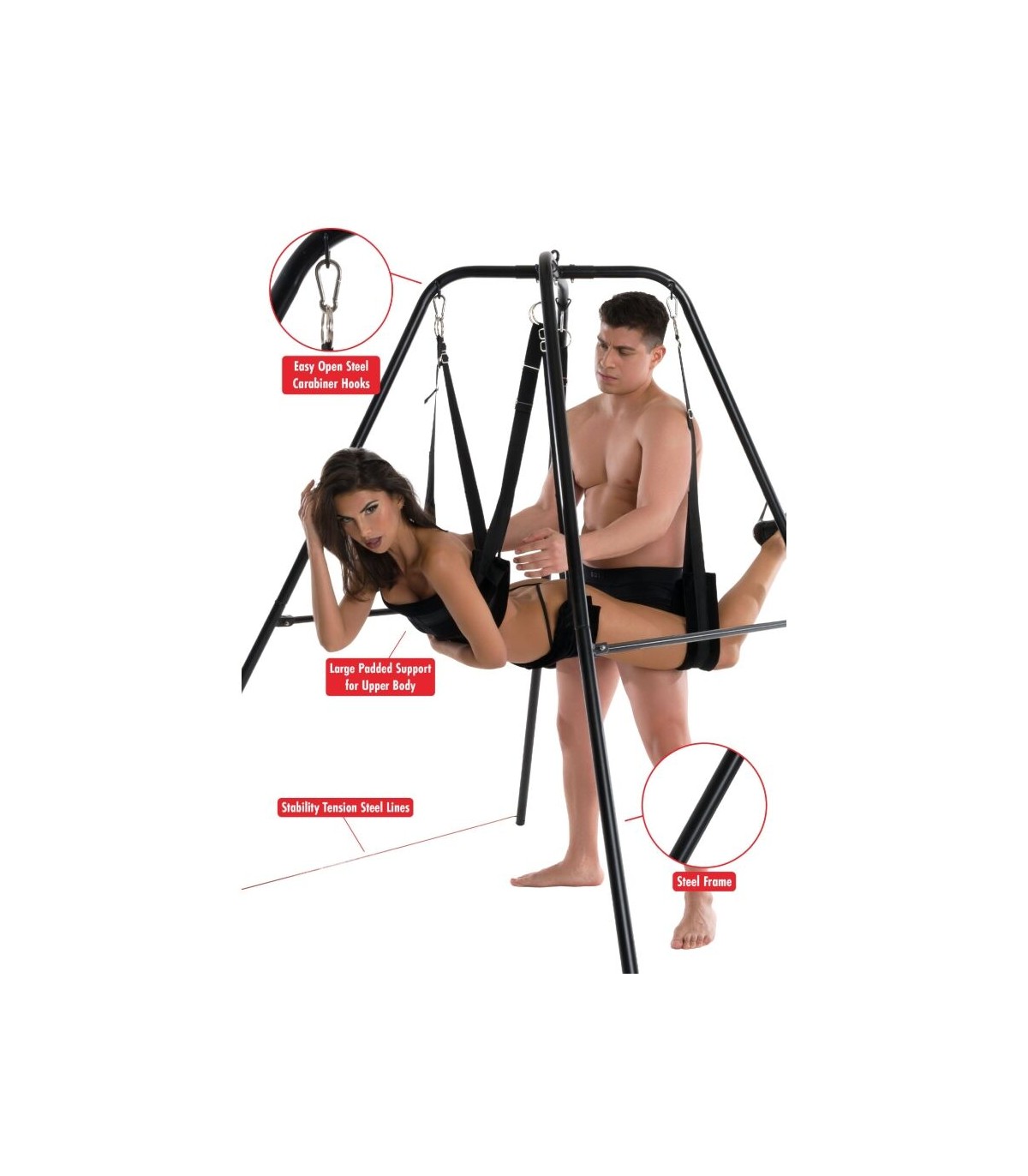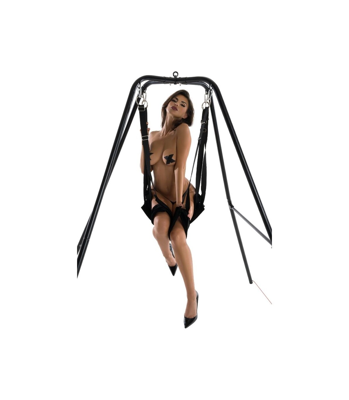 El soporte de acero alcanza una altura de 180 cm y cuenta con una base amplia que garantiza el equilibrio durante el uso más vigoroso. El sistema es totalmente ajustable, permitiendo adaptar las correas de las piernas y el soporte lumbar a diferentes fisonomías y preferencias de altura. Es una herramienta de alta gama pensada para quienes buscan versatilidad, comodidad y un nivel superior de libertad en sus encuentros íntimos.