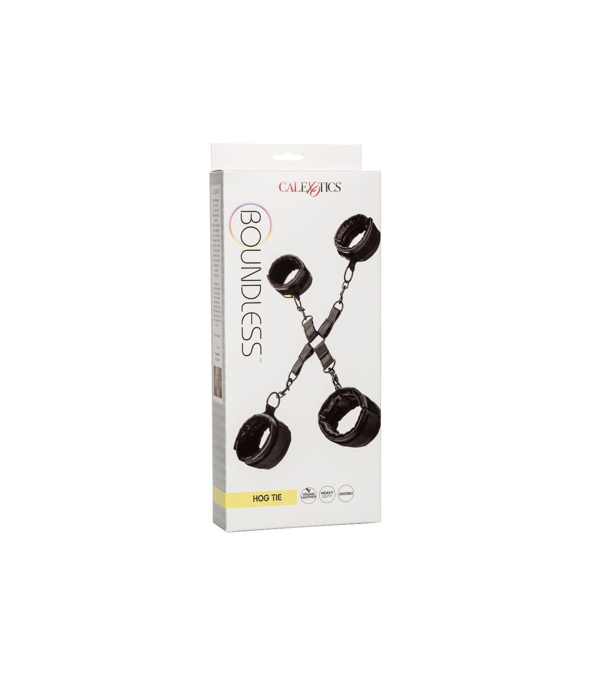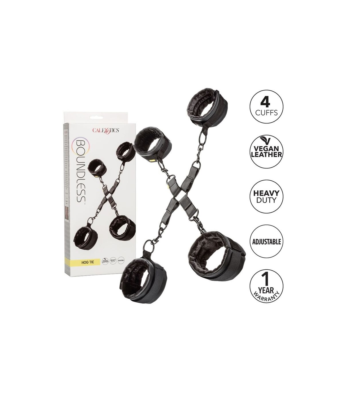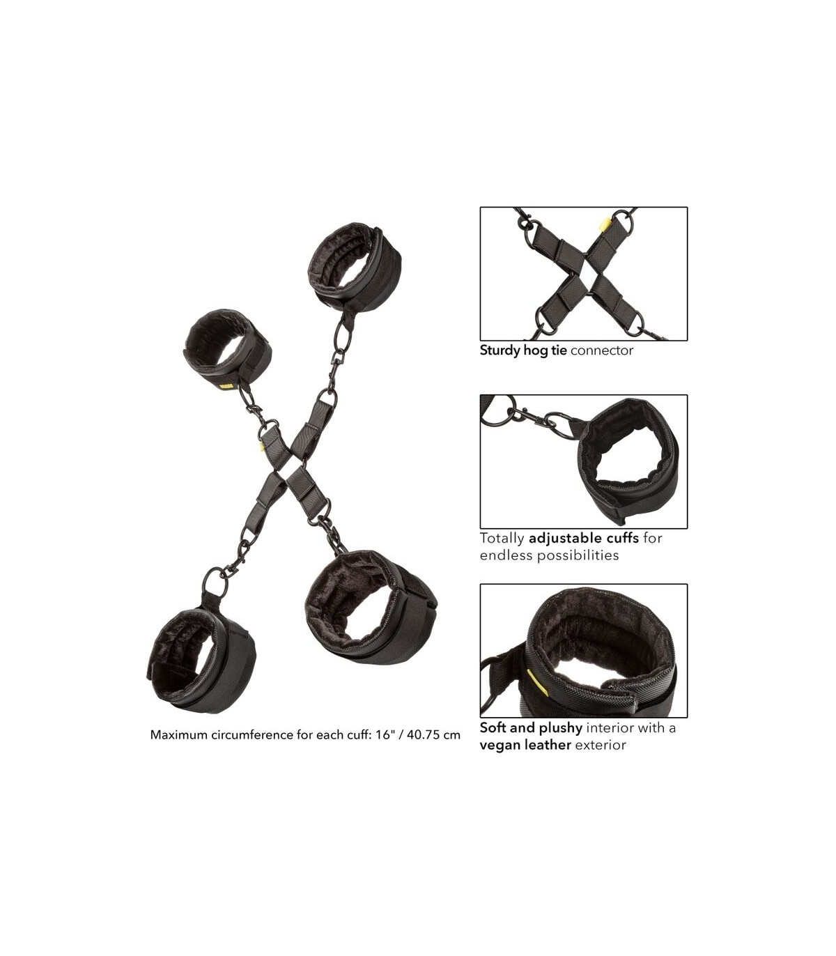 Con 2 puños de tobillo totalmente ajustables y 2 esposas totalmente ajustables atadas con cierres de velcro de gancho y bucle, esta corbata de cerdo también viene con cierres universales y juntas tóricas con un diseño giratorio para una destreza total y máxima comodidad, mientras está totalmente atado.