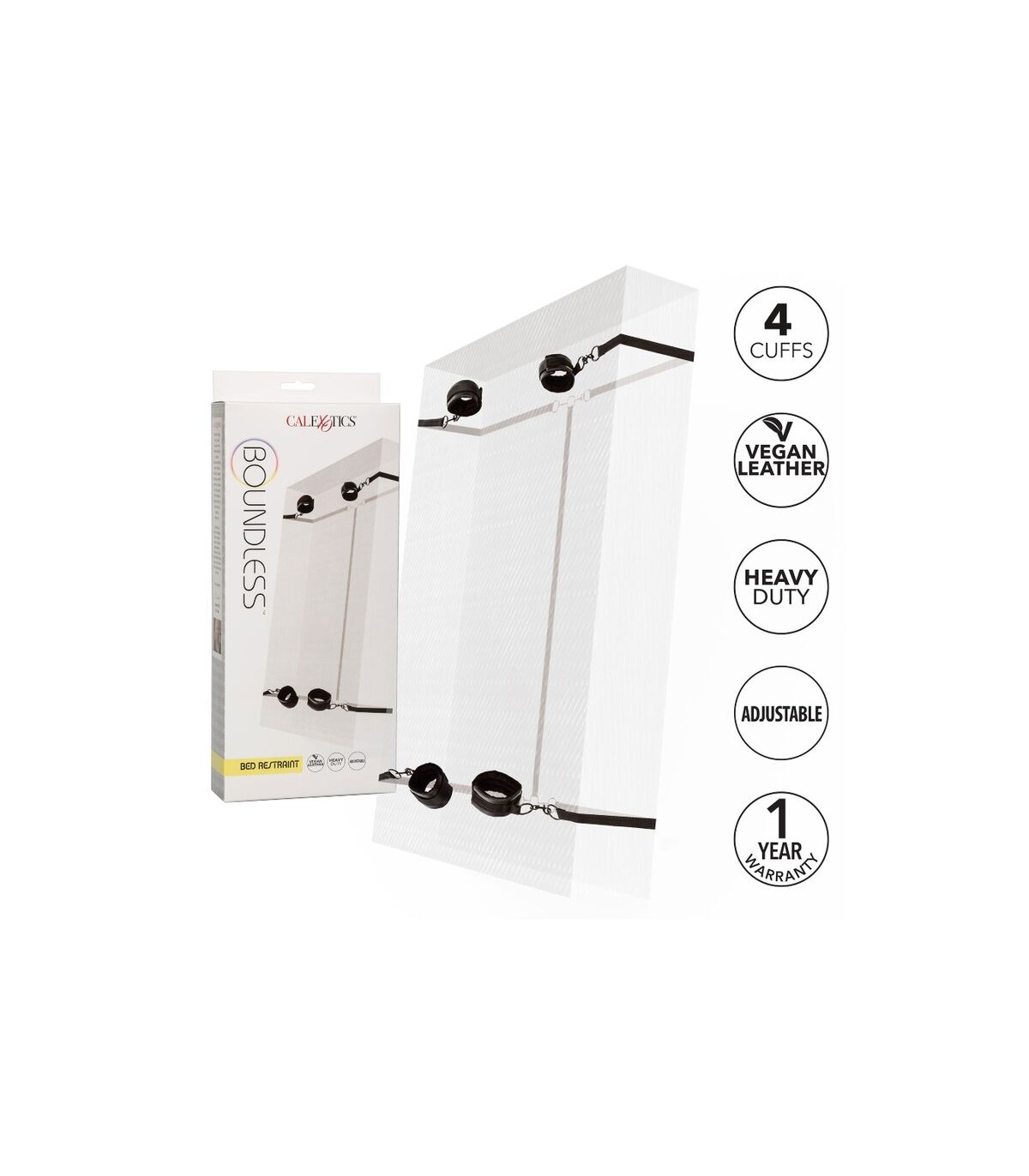 Tenga cuidado: ¡el sistema de restricción de cama Boundless puede atar sus noches durante mucho tiempo! Este juguete para adultos viene con muñequeras y tobillos que ofrecen cierres estilo velcro y aplausos universales, lo que garantiza la máxima comodidad y sujeción.