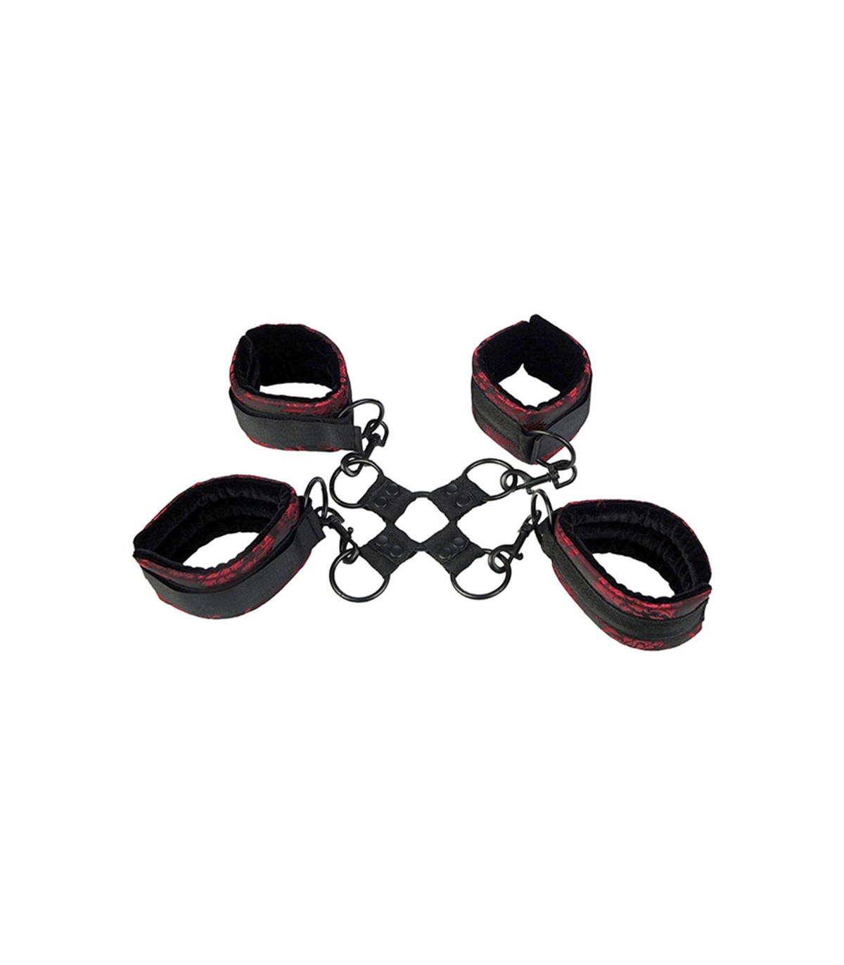 El elegante exterior de brocado rojo y negro le da un toque seductor. Los cierres de velcro garantizan una fácil sujeción y liberación, mientras que los cierres universales con anilla en O giratoria permiten cambios rápidos de posición. Puedes convertir las esposas para usarlas individualmente o combinarlas con otras piezas Scandal.