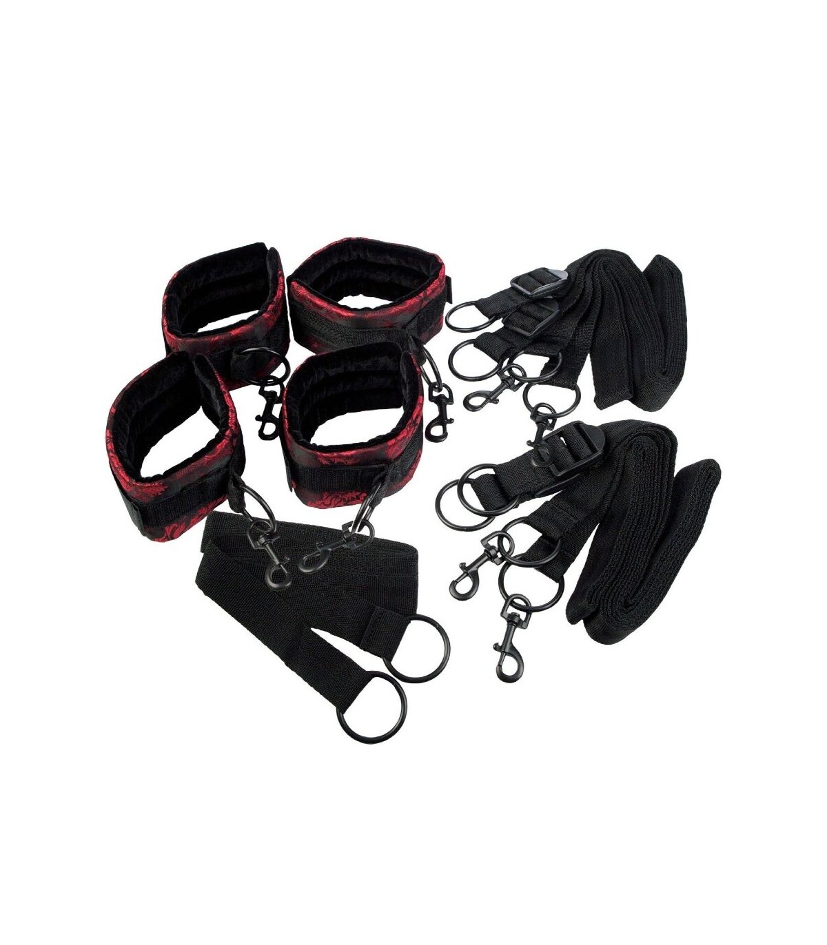 Enrolla las correas alrededor de los postes de la cama o deslízalas debajo del colchón para una sujeción versátil. Con un lujoso brocado rojo y negro e interiores suaves, este conjunto está diseñado para la comodidad, la seducción y un juego de bondage inolvidable.