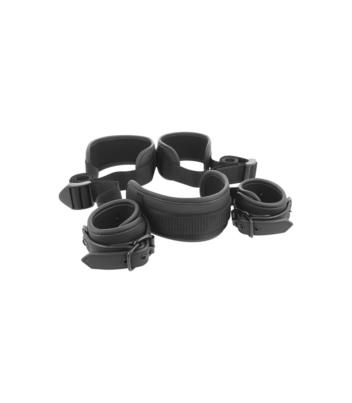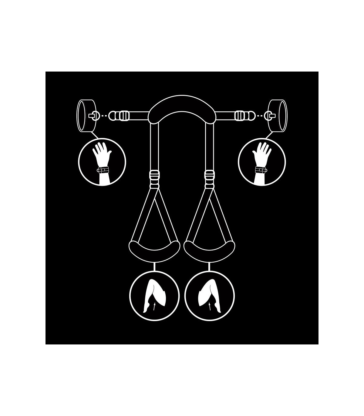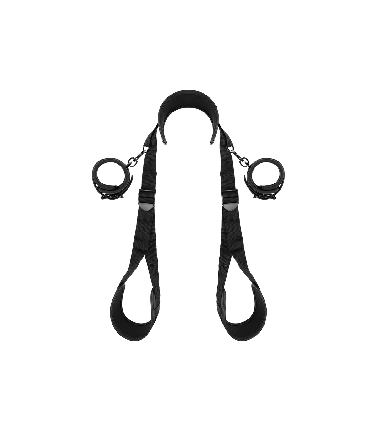 Deje que su imaginación le lleve más allá de sus límites físicos, con la posición Maestro. Ataduras de cuero vegano ajustables y resistentes, para mantener las piernas en su sitio en el momento necesario. El arnés de cuello de cuero vegano es suave y acolchado para una máxima comodidad.