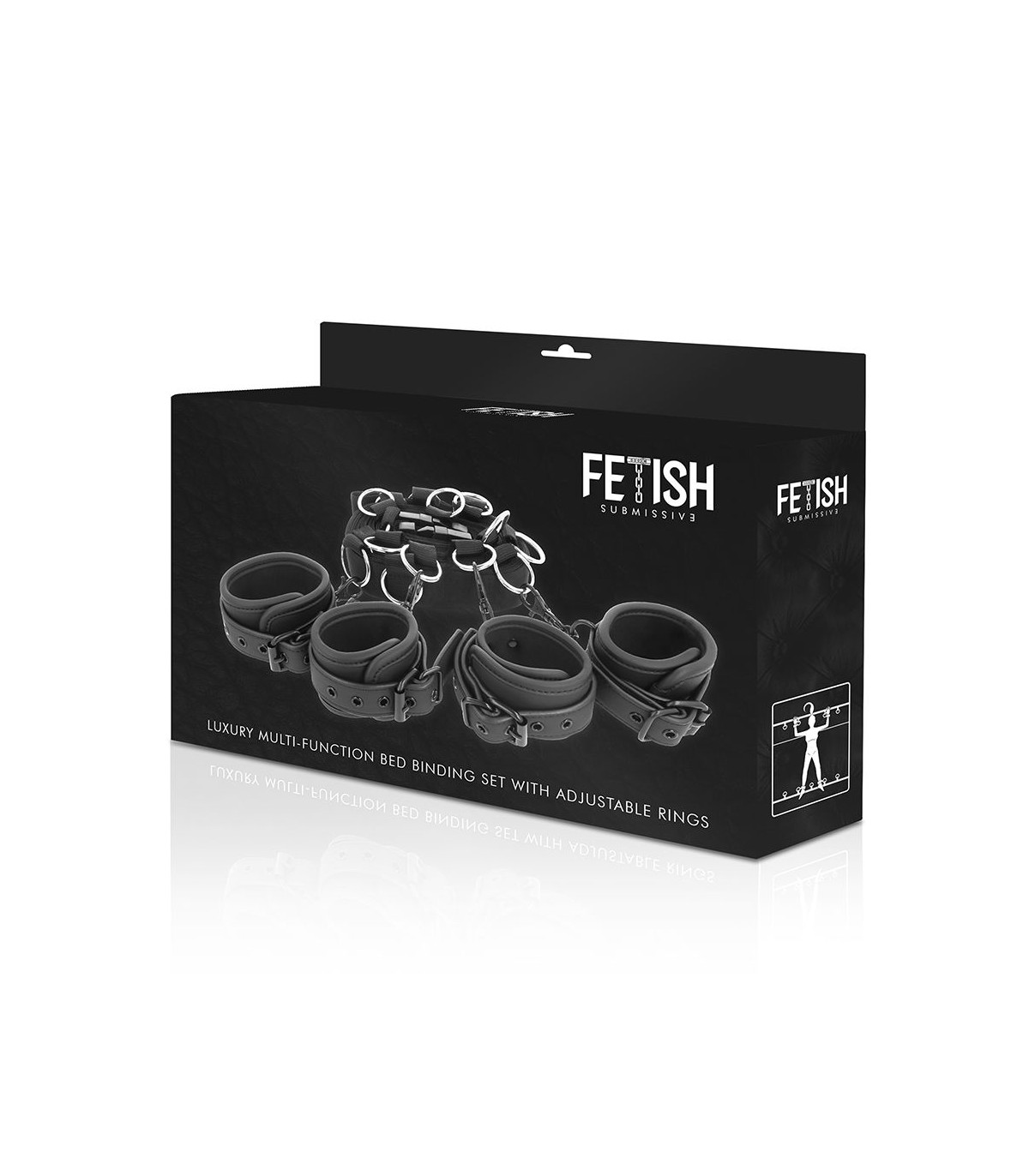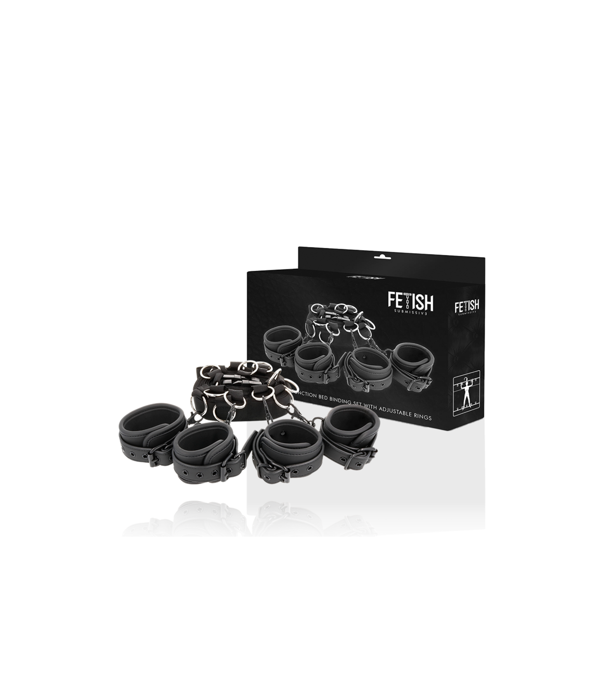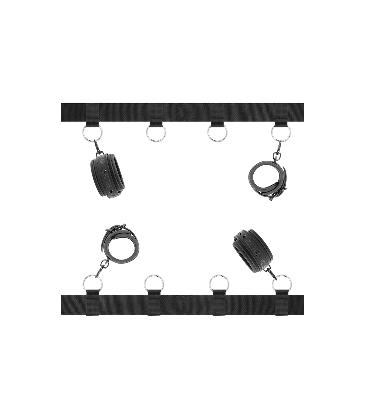 ¡Coge el control de tu amante con este completo set para la cama! Estas esposas te permiten crear una sumisión total de tu amante en la cama, altamente resistentes de cuero vegano y metal libre de niquel. Puedes convertir con este set, la cama en un lugar BDSM.