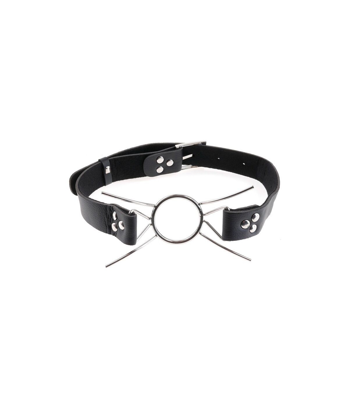 El aro y las piernas evitan que la boca se cierre dejando tu boca ampliamente abierta para meter todo lo que quieras. El diámetro del del aro es de 1.5 pulgadas y la mordaza está sujeta a una correa de cuero que se sujeta por detrás y mantiene mordaza firmemente en su sitio.