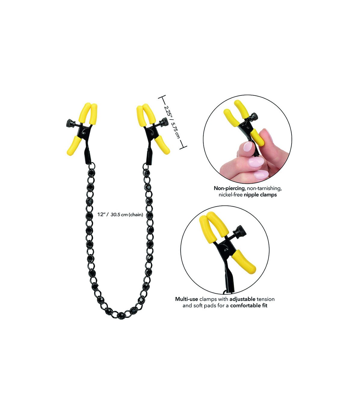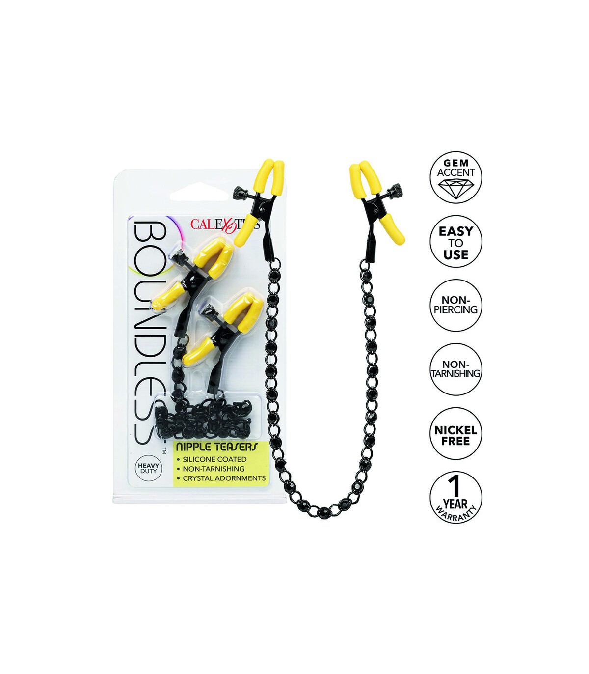 Esfuérzate por alcanzar el placer infinito y abraza la estimulación burlona de los teasers de pezones Boundless. Explora la sensación elevada con las 2 pinzas para pezones totalmente ajustables, la sensual cadena y los cristales brillantes. Alcanza nuevos niveles de placer lúdico con las abrazaderas ajustables. Sujeta los broches traviesos a tu cuerpo y disfruta de cada ráfaga de dolor y placer. La abrazadera tiene una tensión ajustable para estimular cualquier parte de su cuerpo para provocar juguetones. A medida que la tensión se aprieta, el hormigueo se intensifica con cada giro del dial para obtener lo último en juguetes de estimulación de pezones. Con las pinzas de burla, puede esperar amplificar la sensibilidad del pezón e intensificar la excitación general. Estos teasers de pezones fáciles de usar son ideales para todos. Las dos abrazaderas ajustables están hechas de materiales seguros para el cuerpo y cuentan con almohadillas de silicona suaves y cómodas.