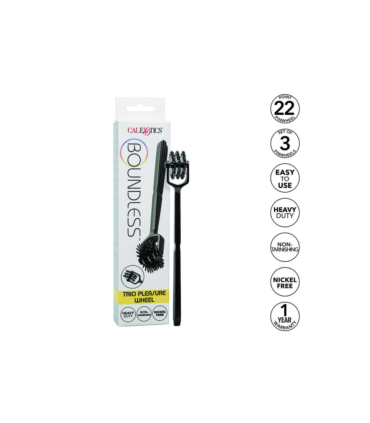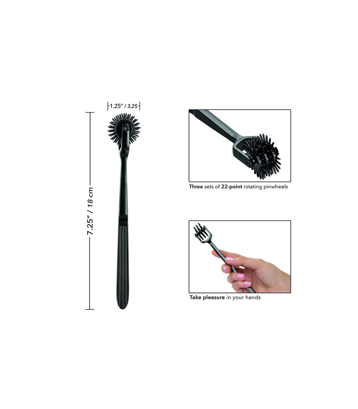 Disfrute de un placer escalofriante sin fin con la atrevida Boundless Trio Pleasure Wheel. La rueda de placer está hecha para emocionar con tres molinillos giratorios de 22 puntos, herrajes de alta resistencia y material que no se empaña. El material resistente y que no se deslustra está hecho para durar un tiempo de juego interminable. Con cada giro por tu piel de deseo, esta rueda apasionada emocionará, emocionará y elevará cada momento íntimo.