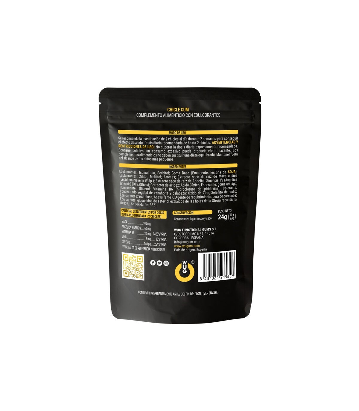 El chicle CUM de WUG GUMS es un complemento alimenticio con un delicioso sabor a plátano natural, diseñado para quienes buscan un apoyo extra en la fertilidad y la vitalidad. Su fórmula combina minerales y vitaminas como Zinc, Selenio y Vitamina B6, junto con extractos de Maca y Angelica sinensis.