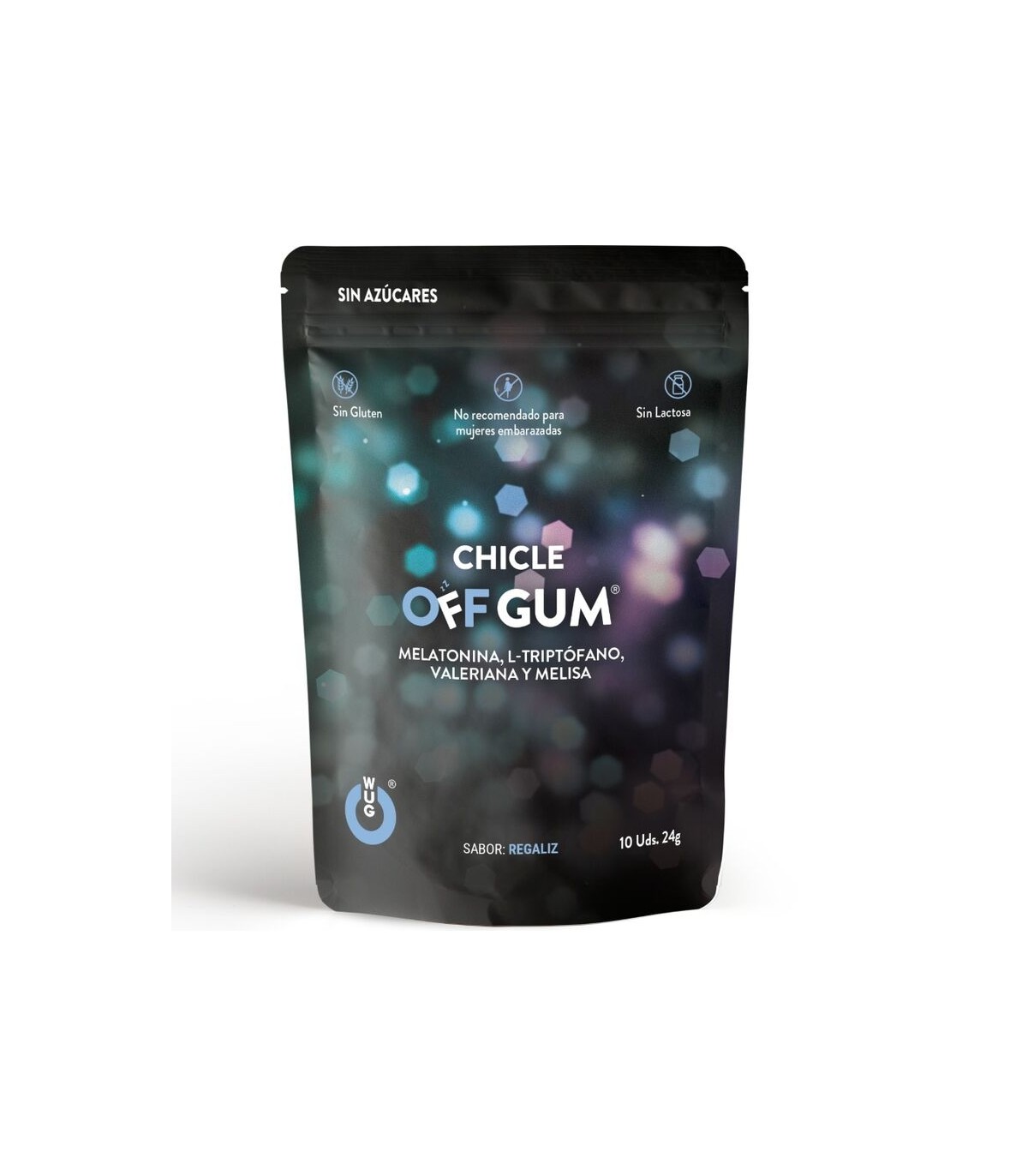 WUG CHICLE OFF GUM es el complemento alimenticio en formato chicle diseñado para acompañarte en los momentos de descanso. Con una fórmula a base de Valeriana, Melisa, L-Triptófano y Melatonina, ayuda a reducir el estrés, favorecer la relajación y contribuir a conciliar el sueño de forma natural.