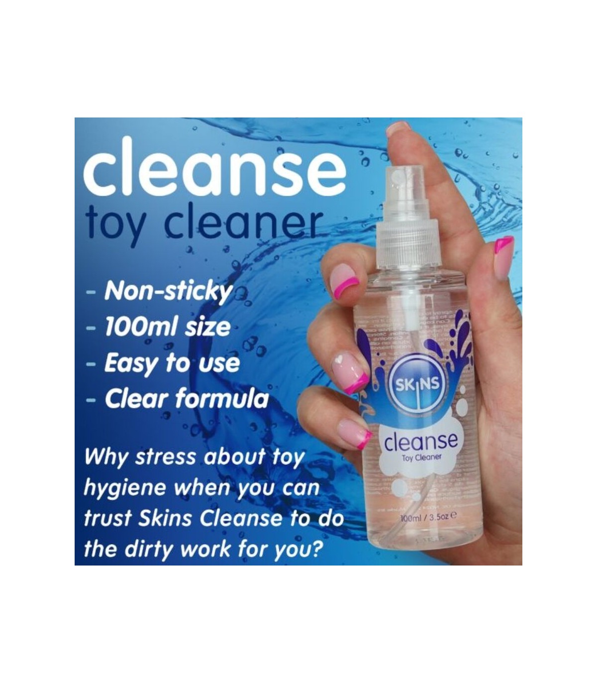 El proceso de uso es sencillo y rápido: basta con pulverizar una pequeña cantidad sobre el juguete, dejar actuar aproximadamente treinta segundos y limpiar suavemente las zonas de difícil acceso. Después, solo hay que enjuagar con agua tibia o retirar el exceso con un paño. El juguete puede dejarse secar al aire o secarse cuidadosamente con una toalla limpia, quedando listo para ser guardado hasta la próxima sesión de juego. Con un producto fiable, práctico y de alta calidad como el spray limpiador de juguetes Skins, tus clientes podrán disfrutar de sus juguetes de forma higiénica y segura.