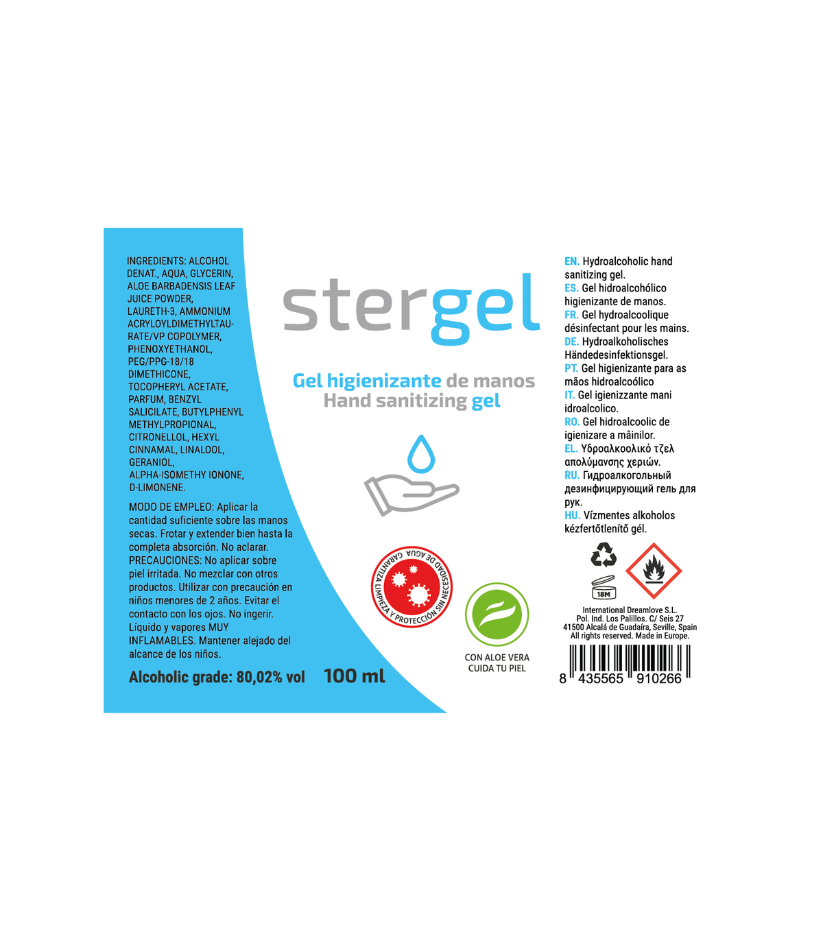 Este gel hidroalcohólico cumple con: Bactericida conforme Norma EN1500 (Desinfeción Higiénica de Manos por Fricción), Norma EN 12791 (Desinfección Quirúrgica de Manos) y viricida conforme EN14476.