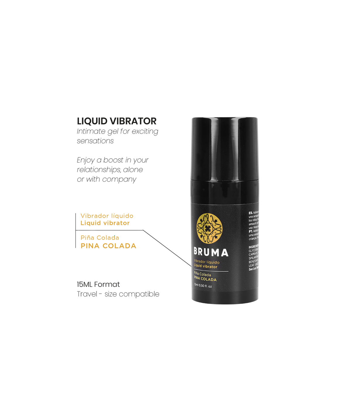 El vibrador líquido sabor piña colada de la marca BRUMA es un gel íntimo diseñado para proporcionar sensaciones excitantes y placenteras durante tus momentos más íntimos. Este producto innovador está pensado para darte un impulso extra en tus relaciones, ya sea en solitario o en compañía, haciendo que cada experiencia sea única y memorable.