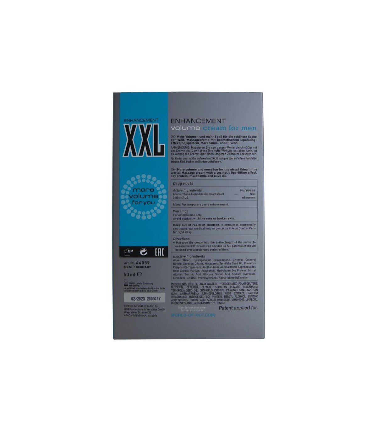 ¡Más volumen y más diversión para lo mejor del mundo! Esta crema de masaje presenta un efecto de lipofilling cosmético que puede mejorar la apariencia y favorecer un aspecto más firme y juvenil.