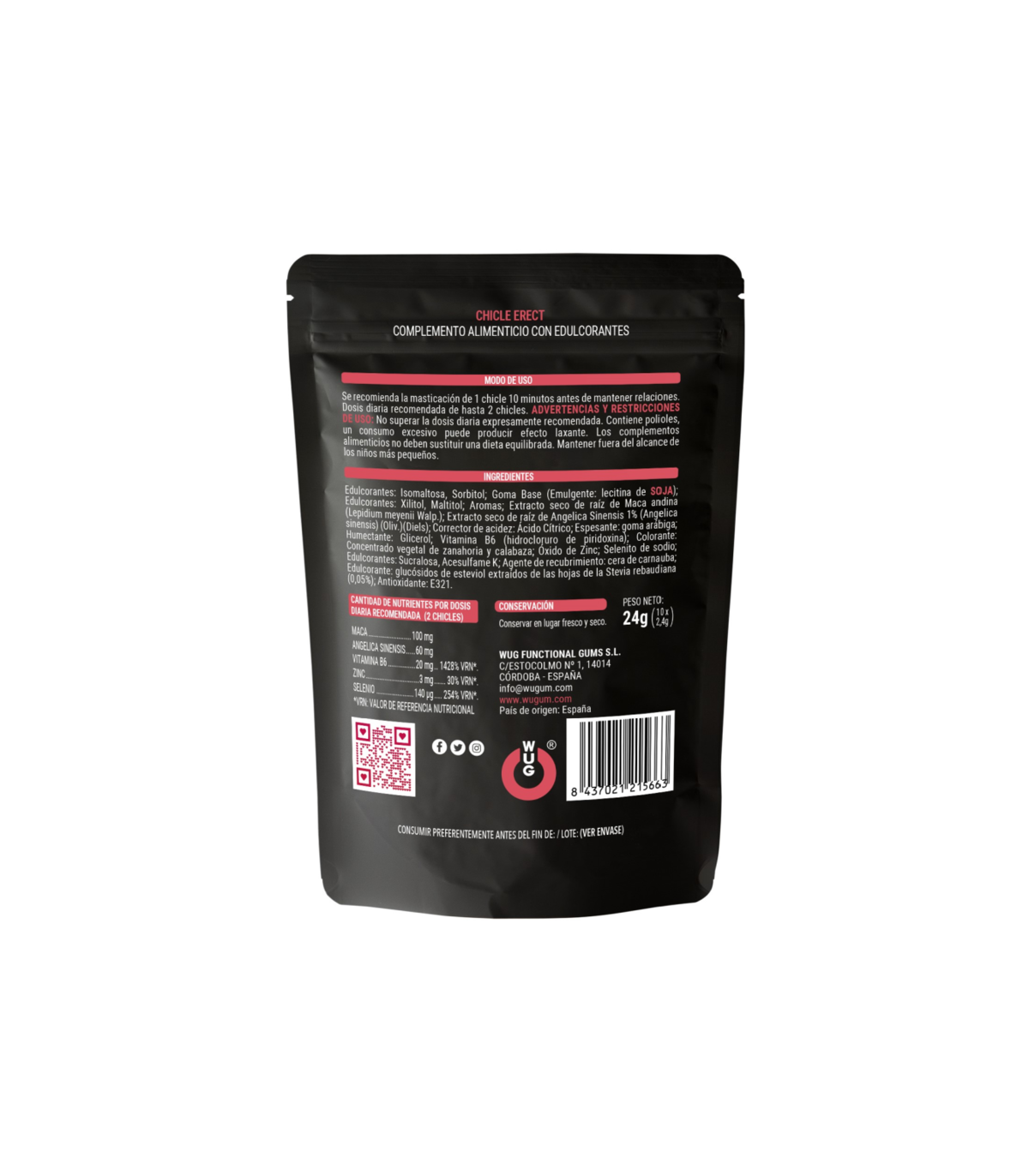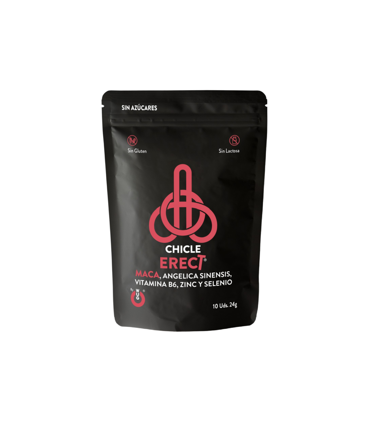 WUG ERECT es un complemento alimenticio en formato chicle funcional que combina extractos vegetales y nutrientes esenciales. Su fórmula innovadora permite una rápida liberación de los ingredientes activos a través de la mucosa bucal, sin necesidad de agua ni digestión.