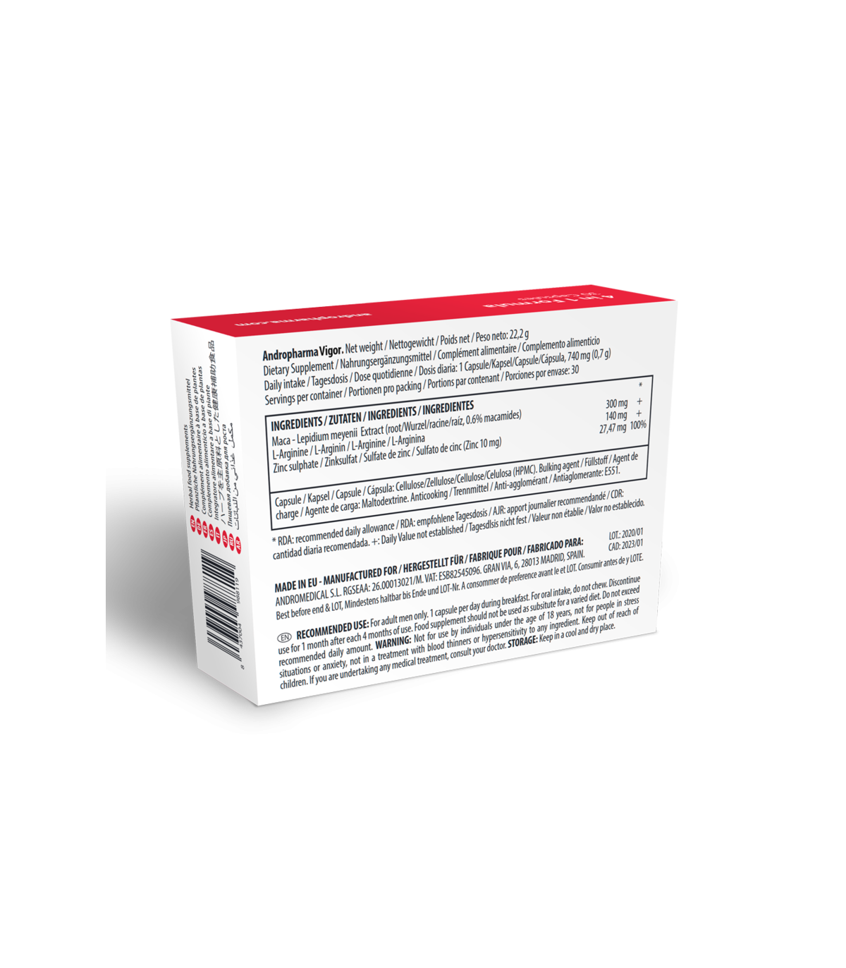 Andropharma Vigor es un complemento alimenticio en cápsulas, a base de extractos vegetales, minerales y aminoácidos, desarrollado para apoyar la vitalidad masculina y favorecer una vida íntima plena. Su fórmula avanzada de tercera generación combina ingredientes tradicionales como maca, damiana, ginseng, ginkgo biloba y L-arginina, junto con zinc, contribuyendo al funcionamiento normal de la testosterona y al rendimiento sexual.