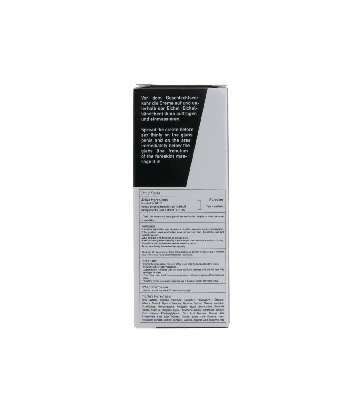 Su composición contiene ginkgo biloba, reconocido por sus propiedades para mejorar la circulación y fortalecer el rendimiento, lo que contribuye a un mayor control y resistencia. Al aplicar la crema antes del acto, podrá beneficiarse de sus efectos de larga duración, permitiéndole no solo extender la intimidad, sino también recuperar la confianza y el dominio total de sus sensaciones.