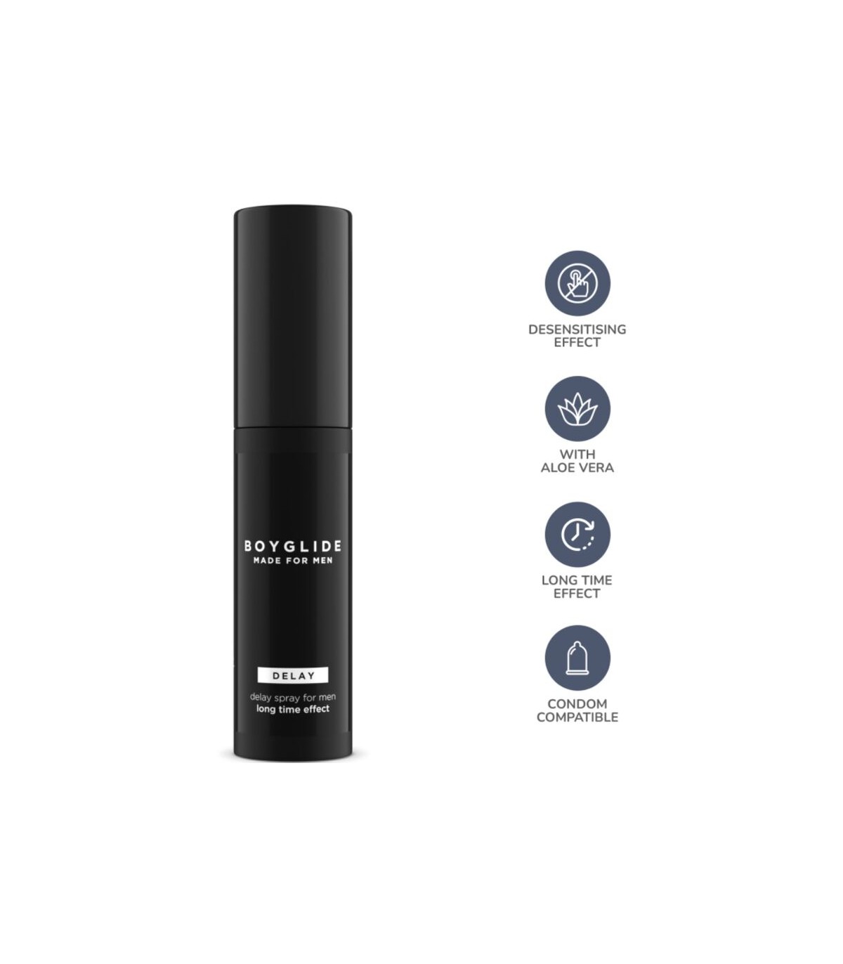 Ideal para usar en casos de hipersensibilidad de la piel, ayuda a prolongar la relación íntima. El efecto desensibilizante de Boyglide Delay permite prolongar las relaciones sexuales en casos de hipersensibilidad cutánea o simplemente para aquellos que desean una relación sexual más duradera.