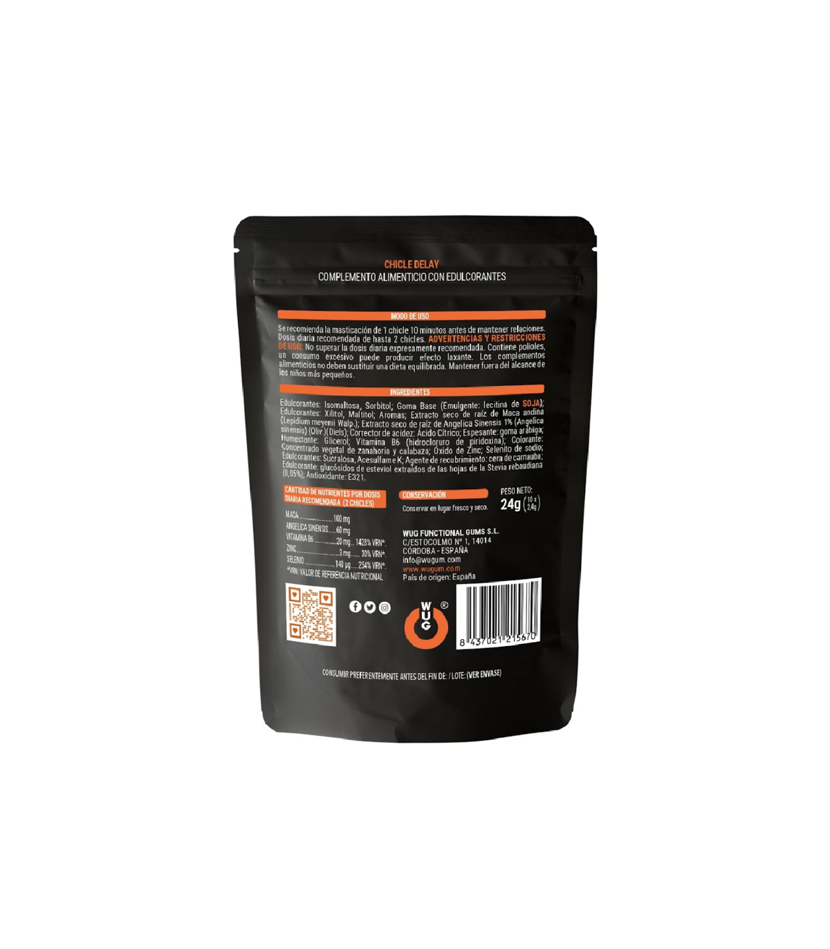 El chicle DELAY de WUG GUMS es un complemento alimenticio pensado para quienes buscan un apoyo extra en sus momentos más íntimos. Su fórmula combina extractos vegetales con minerales y vitaminas como Zinc, Selenio y Vitamina B6, que ayudan a mantener el equilibrio hormonal, contribuyen a la reducción del cansancio y la fatiga, y protegen las células frente al estrés oxidativo.