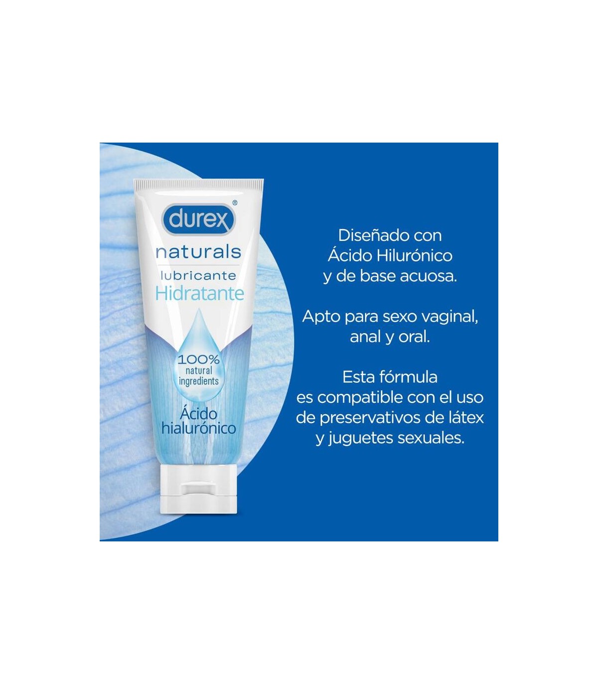 Durex Naturals Hidratante, es un lubricante hecho con ingredientes 100% naturales y ácido hialurónico natural que proporciona una hidratación de larga duración. Este lubricante íntimo de Durex aporta los siguientes beneficios: