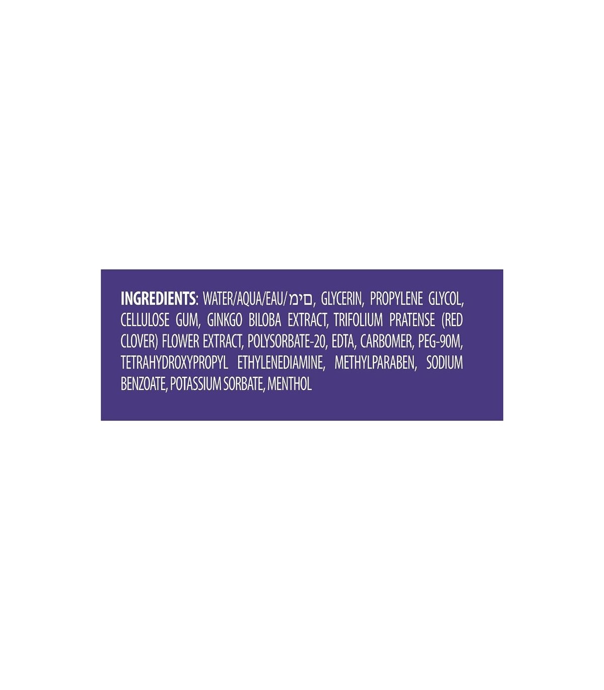 agua, glicerina, propilenglicol, goma de celulosa, extracto de ginkgo biloba, extracto de flor de trifolium pratense (trébol rojo), polisorbato-20, EDTA, carbómero, PEG-90M, tetrahidroxipropiletilendiamina, metilparabeno, benzoato de sodio, sorbato de potasio, mentol