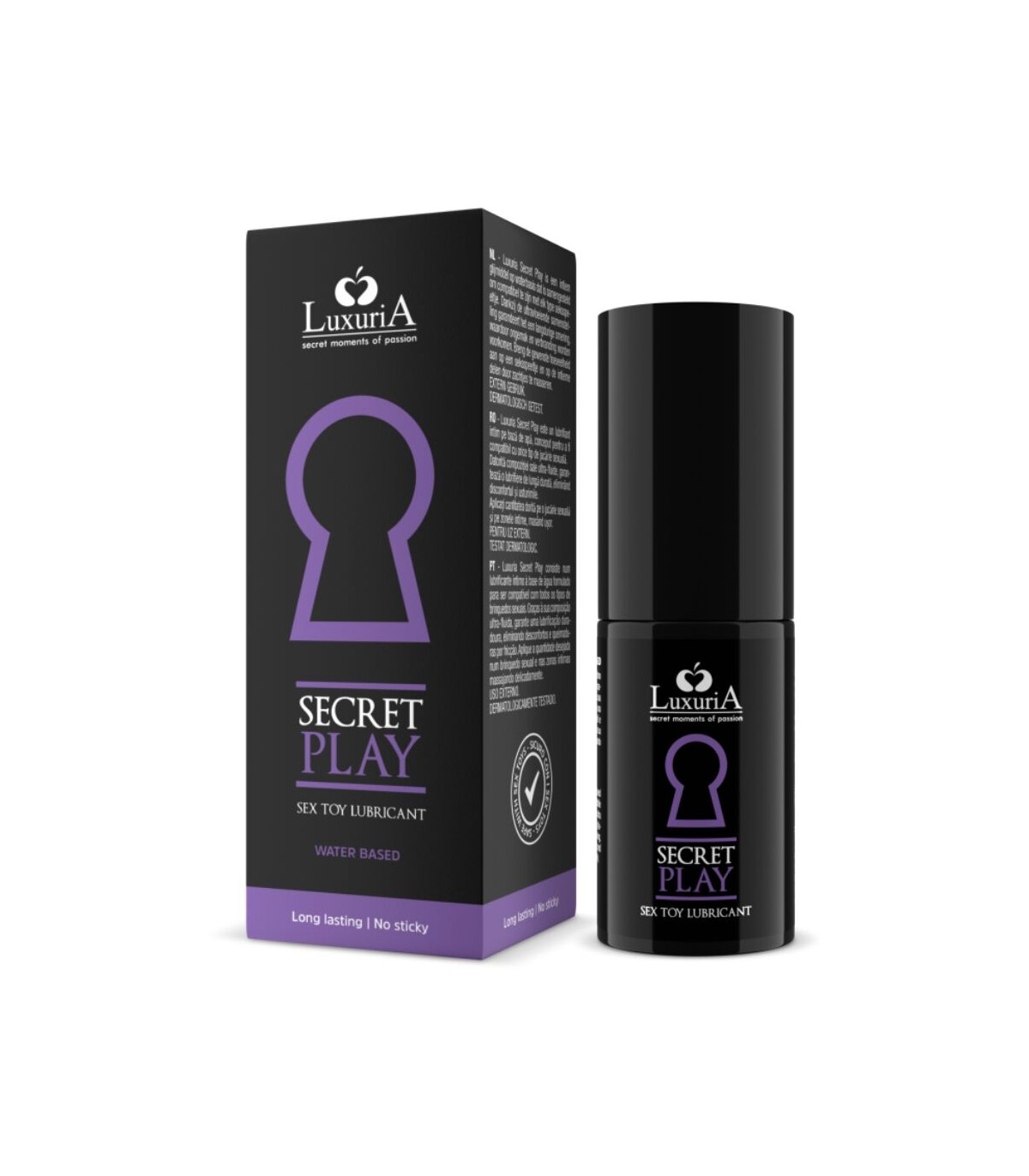 Luxuria Secret Play es un lubricante íntimo a base de agua formulado para ser compatible con cualquier tipo de juguete sexual.