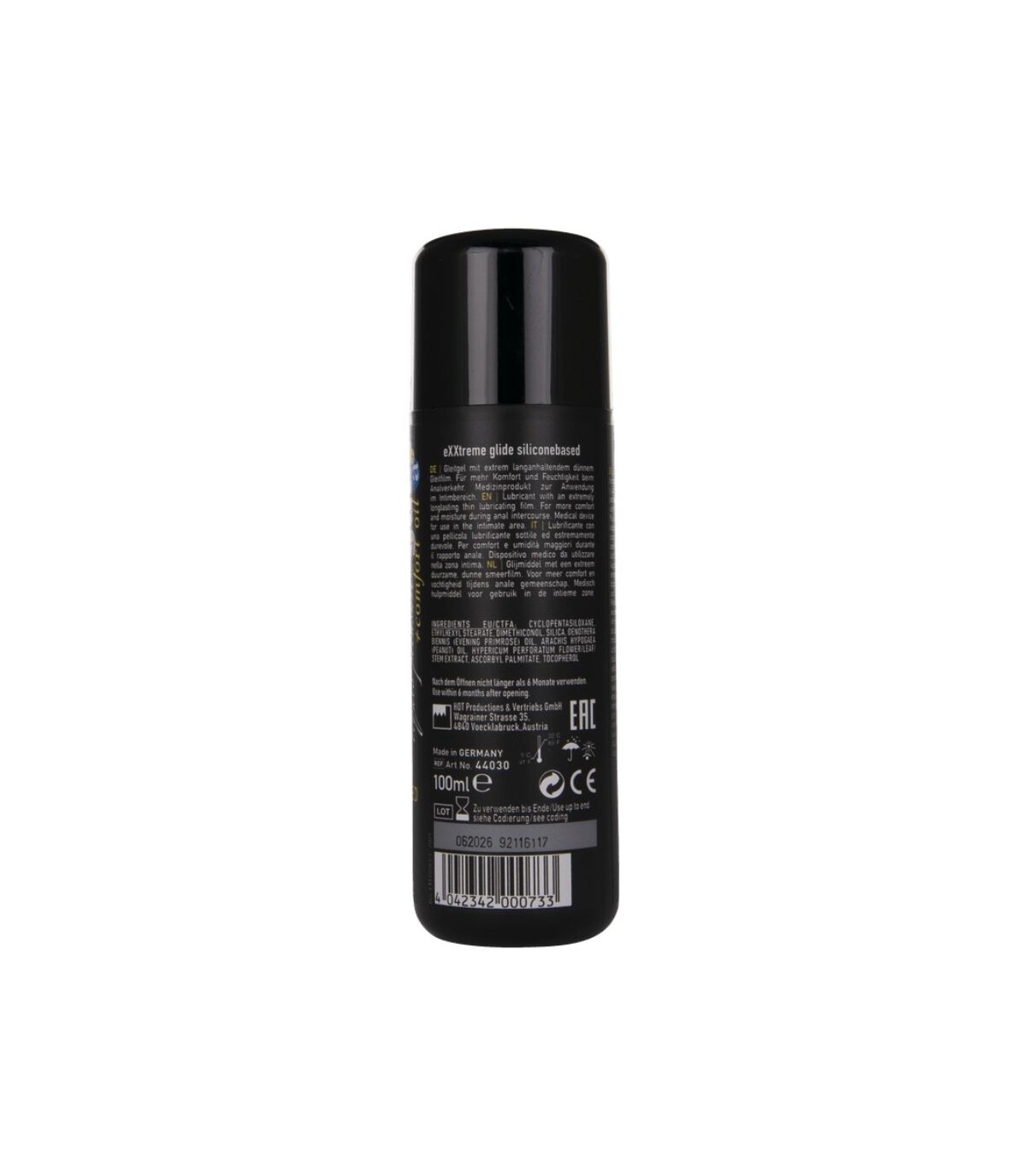 Nuestra fórmula única contiene extractos calmantes de hierba de San Juan y aceite de onagra, que ayudan a relajar los músculos y facilitan una penetración suave. La combinación de aceites de silicona cosmética premium proporciona un nivel de deslizamiento excepcionalmente alto, creando una película lubricante de larga duración que deja una sensación suave y sedosa en la piel.