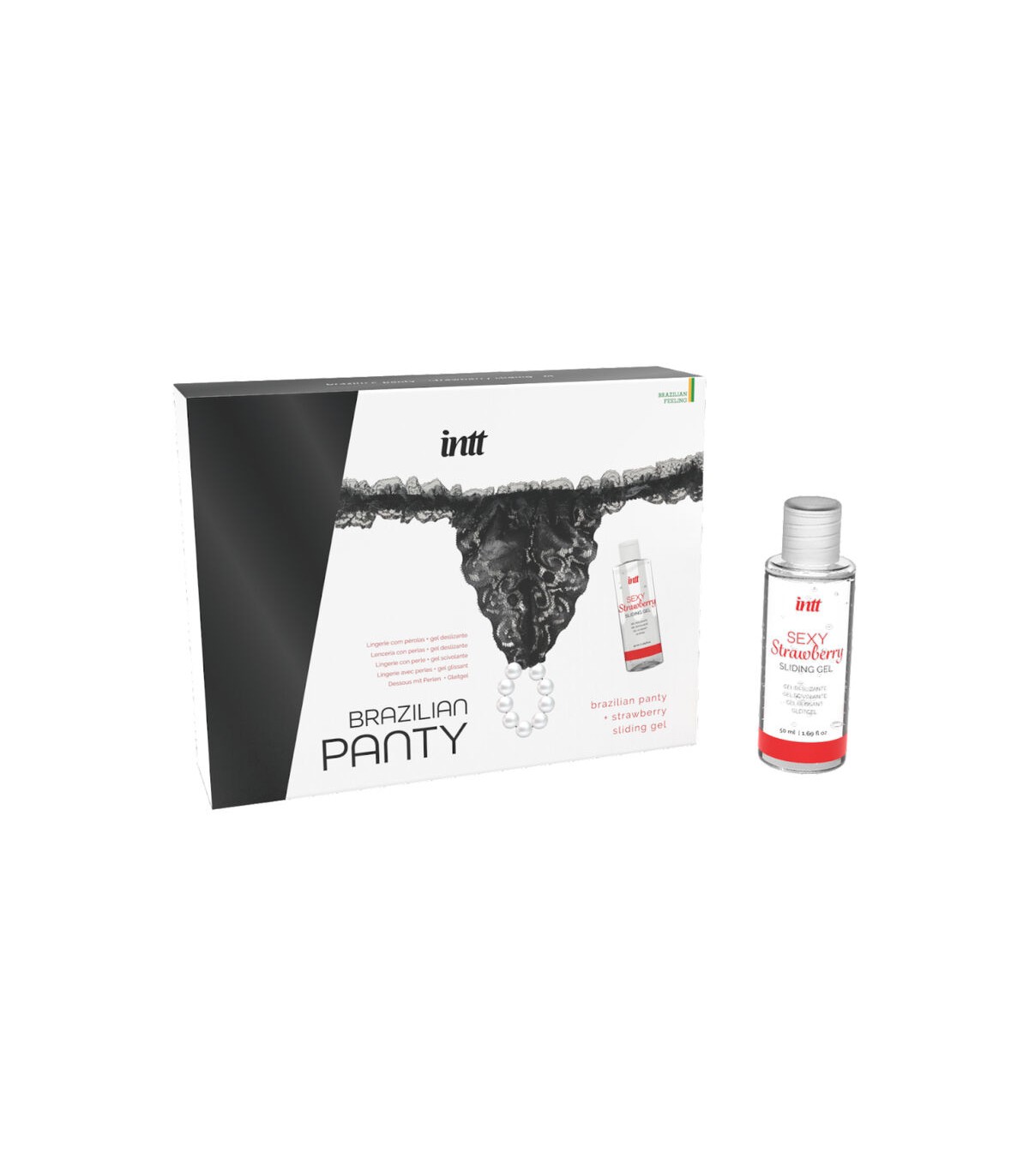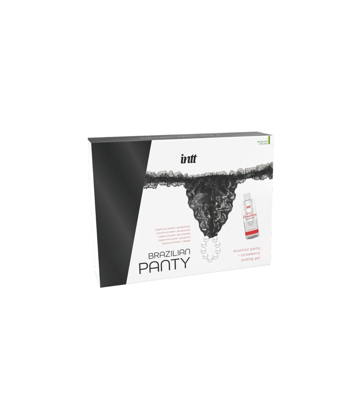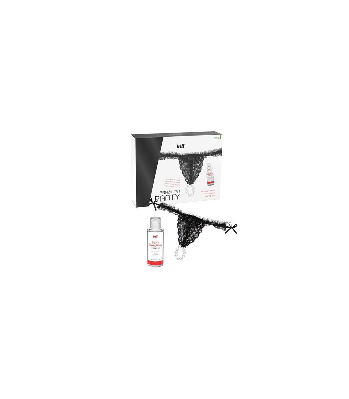 Brazilian Panty Black de INTT es un sensual pack de lencería con perlas acompañado de un gel a base de agua con sabor a fresa.