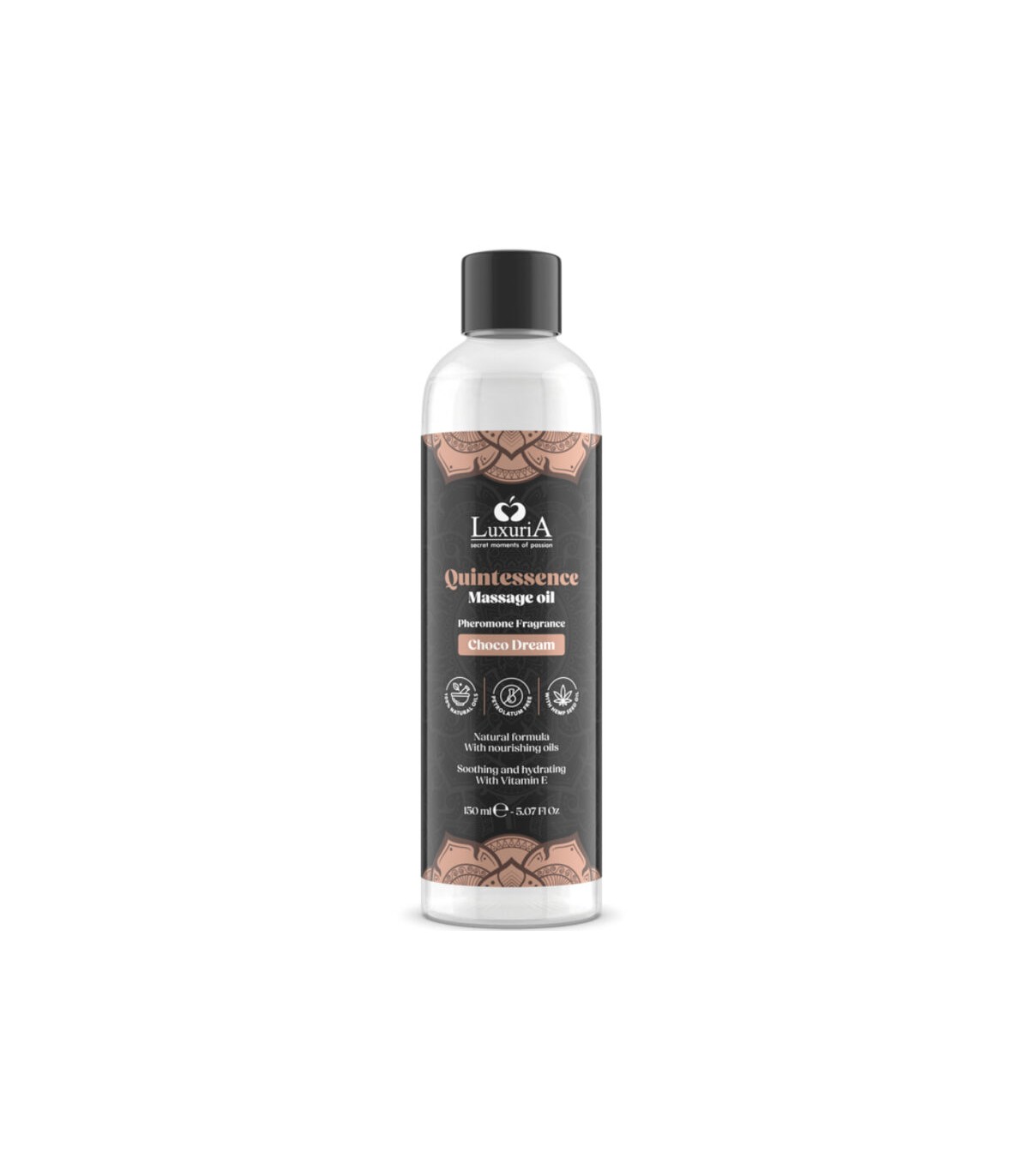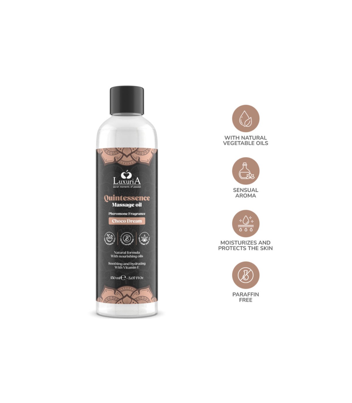 Quintessence Massage Oil, Chocolate Es un aceite natural y refinado para masajes, enriquecido con formulaciones exclusivas a base de aceites de alta calidad y esencias estimulantes cuidadosamente seleccionadas. Su fórmula nutritiva, elaborada con aceites vegetales completamente naturales, combinada con aromas sensuales, proporciona una hidratación intensa, dejando la piel suave y perfumada. Libre de parafina, el aceite Quintessence Massage Oil respetará y protegerá tu piel gracias a la presencia de aceite de semillas de cáñamo, estimulando tus sentidos con suaves notas de azúcar glas que te acompañarán durante todo el masaje, guiándote hacia la Quintessencia del placer.