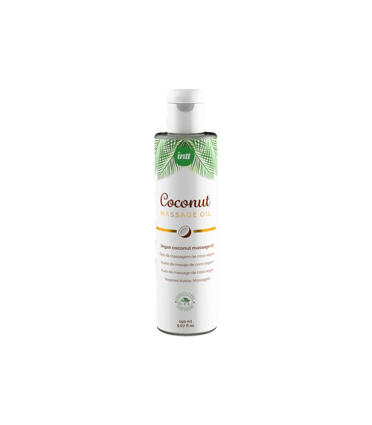 Massage Oil Vegan Coconut de INTT es un aceite de masaje con aroma a dulce coco muy deslizante que deja la piel aterciopelada para un masaje corporal relajante o erótico.