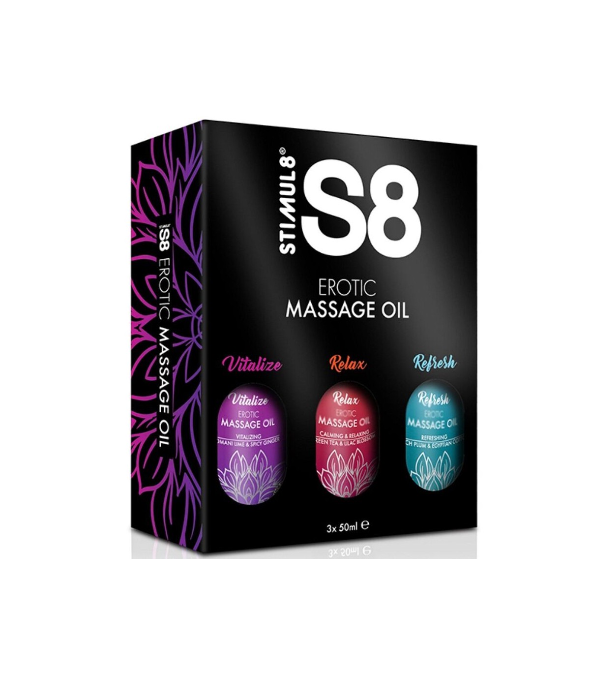 Estos ricos aceites de masaje S8 son una mezcla única de 3 potentes aceites: aceite de jojoba, que calma y fortalece la piel; aceite de almendras, que hidrata y cuida la piel; y aceite de sésamo, que es altamente nutritivo y lubricante. Este aceite S8 está enriquecido con vitaminas y minerales esenciales. Después de un buen masaje, su piel se sentirá sedosa, suave y relajada. Esta caja incluye 3 aromas diferentes: lima omaní y jengibre picante; té verde y flor de lila; y ciruela francesa y algodón egipcio.