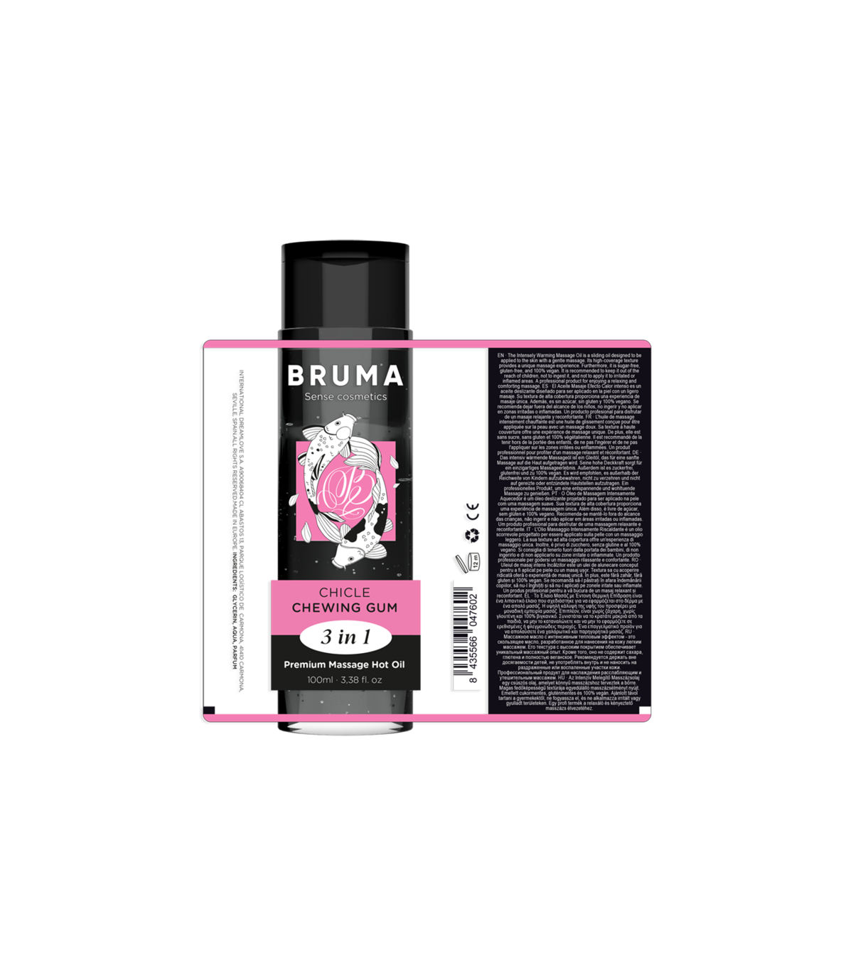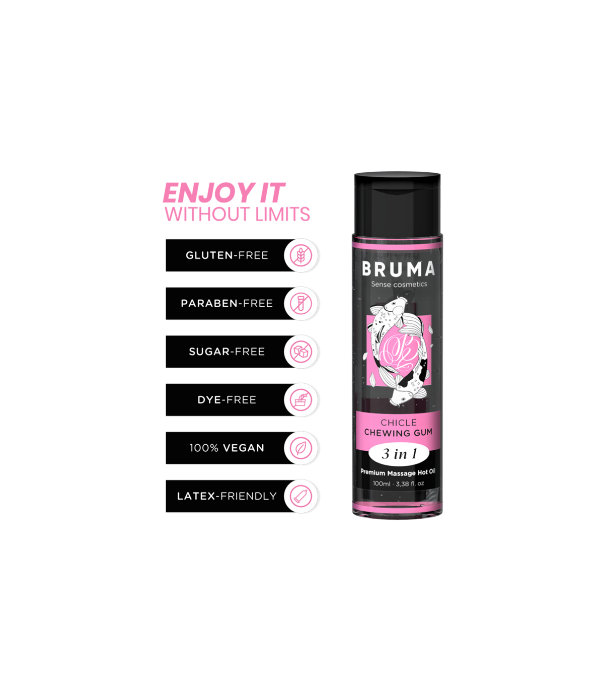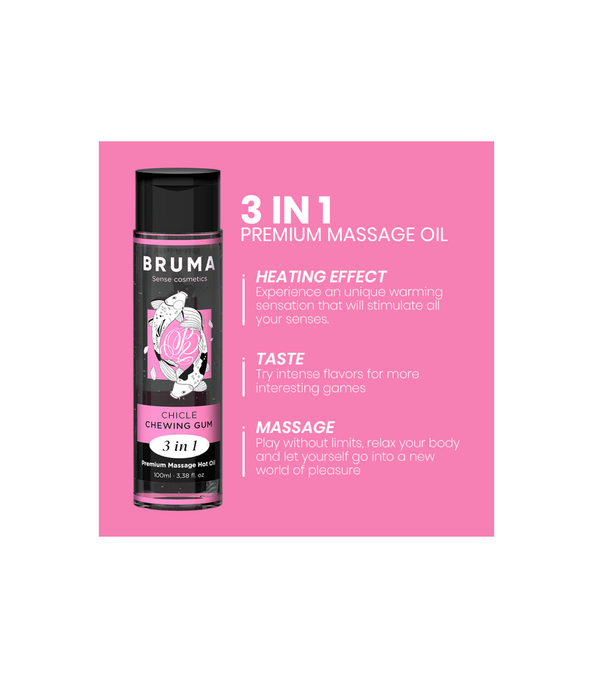 El Aceite de Masaje Premium Efecto Calor con sabor a chicle de la marca BRUMA es una auténtica joya en el mundo del bienestar y la intimidad. Este exquisito producto, presentado en un elegante envase de 100 ml, está diseñado para proporcionar una experiencia única y sensual, brindando un masaje relajante y estimulante con un toque de calidez que lo hace aún más especial. Aquí están los puntos destacados desarrollados en detalle: