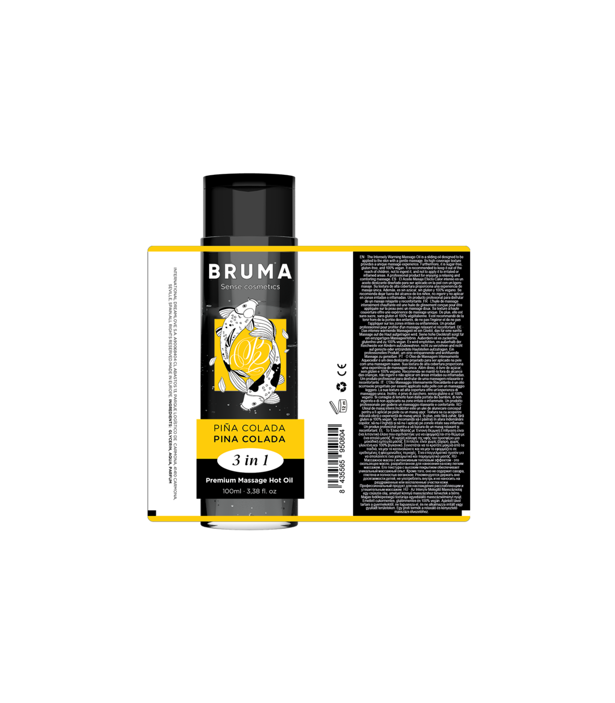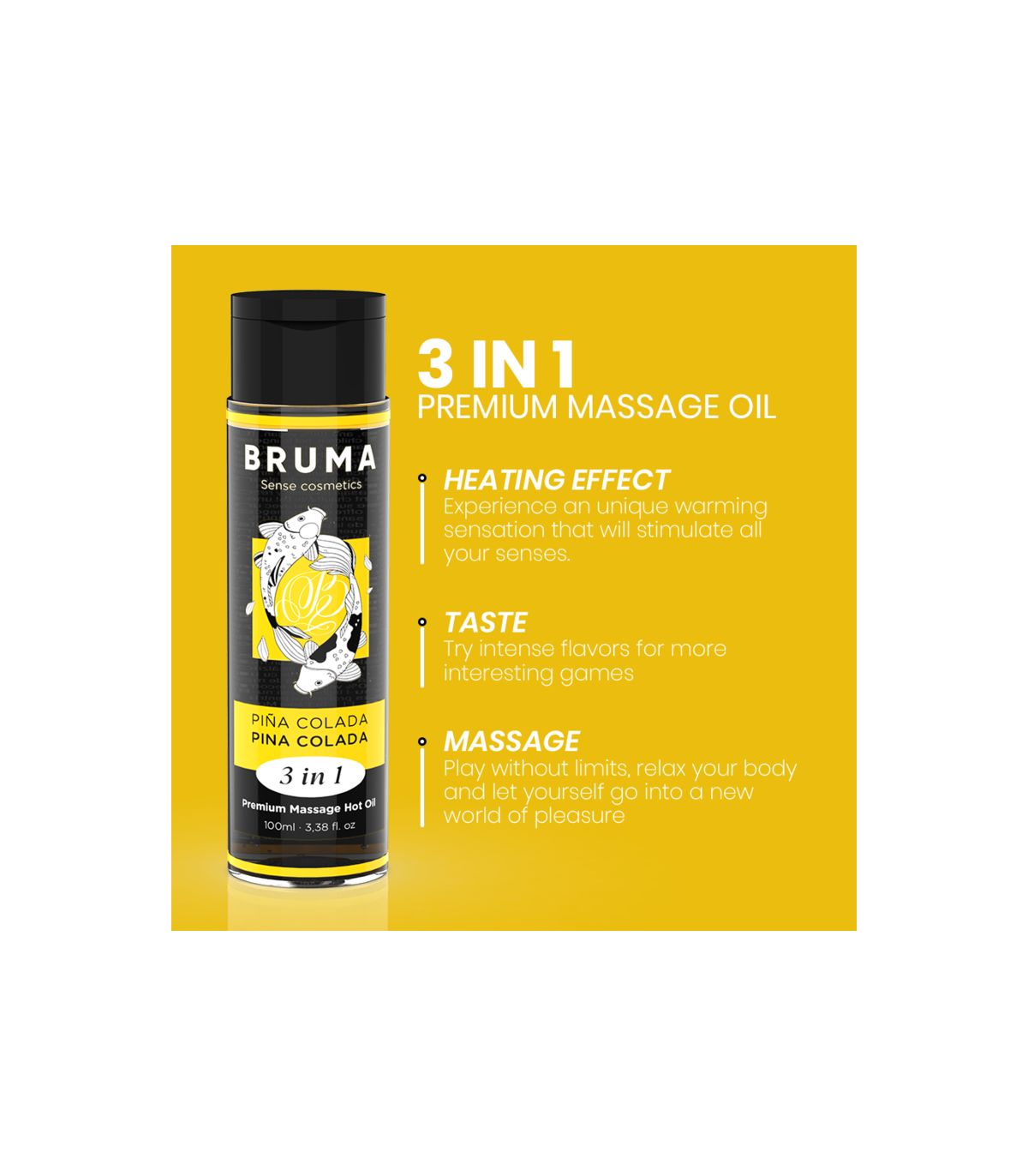 El Aceite de Masaje Premium Efecto Calor con sabor a Piña Colada de la marca BRUMA es una auténtica joya en el mundo del bienestar y la intimidad. Este exquisito producto, presentado en un elegante envase de 100 ml, está diseñado para proporcionar una experiencia única y sensual, brindando un masaje relajante y estimulante con un toque de calidez que lo hace aún más especial. Aquí están los puntos destacados desarrollados en detalle: