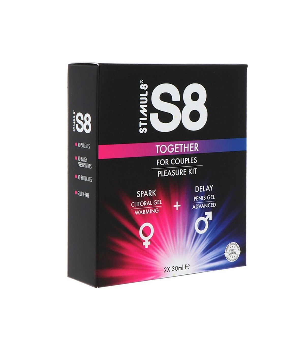 Comparte la diversión con el Kit Together de S8. ¿Buscas productos de cuidado íntimo que las parejas puedan disfrutar juntas? Entonces te encantará el nuevo Kit Together de S8. Este set incluye el atractivo gel para el clítoris S8 Spark para ella y el gel retardante S8 para él. Al combinarlos en una sola sesión de pasión, Spark electrizará los sentidos femeninos y las zonas erógenas, mientras que Delay le permite a él alcanzar la excitación más intensa y prolongada. El dúo perfecto: Spark y Delay son una combinación premium para que las parejas exploren sus deseos simultáneamente. Por eso, S8 ha combinado las dos fórmulas en un atractivo set con un gran atractivo para regalar.