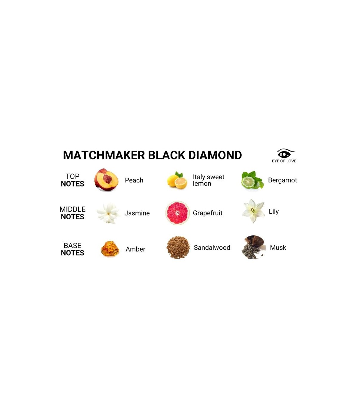 La fragancia posee un aroma a mezcla audaz de cedro, grosella negra y limón. Con unos tonos sutiles de roble, ámbar blanco y almizcle. Muy suave y dulce, virilidad y atracción irresistible son sinónimos del perfume Matchmaker Black Diamond.
