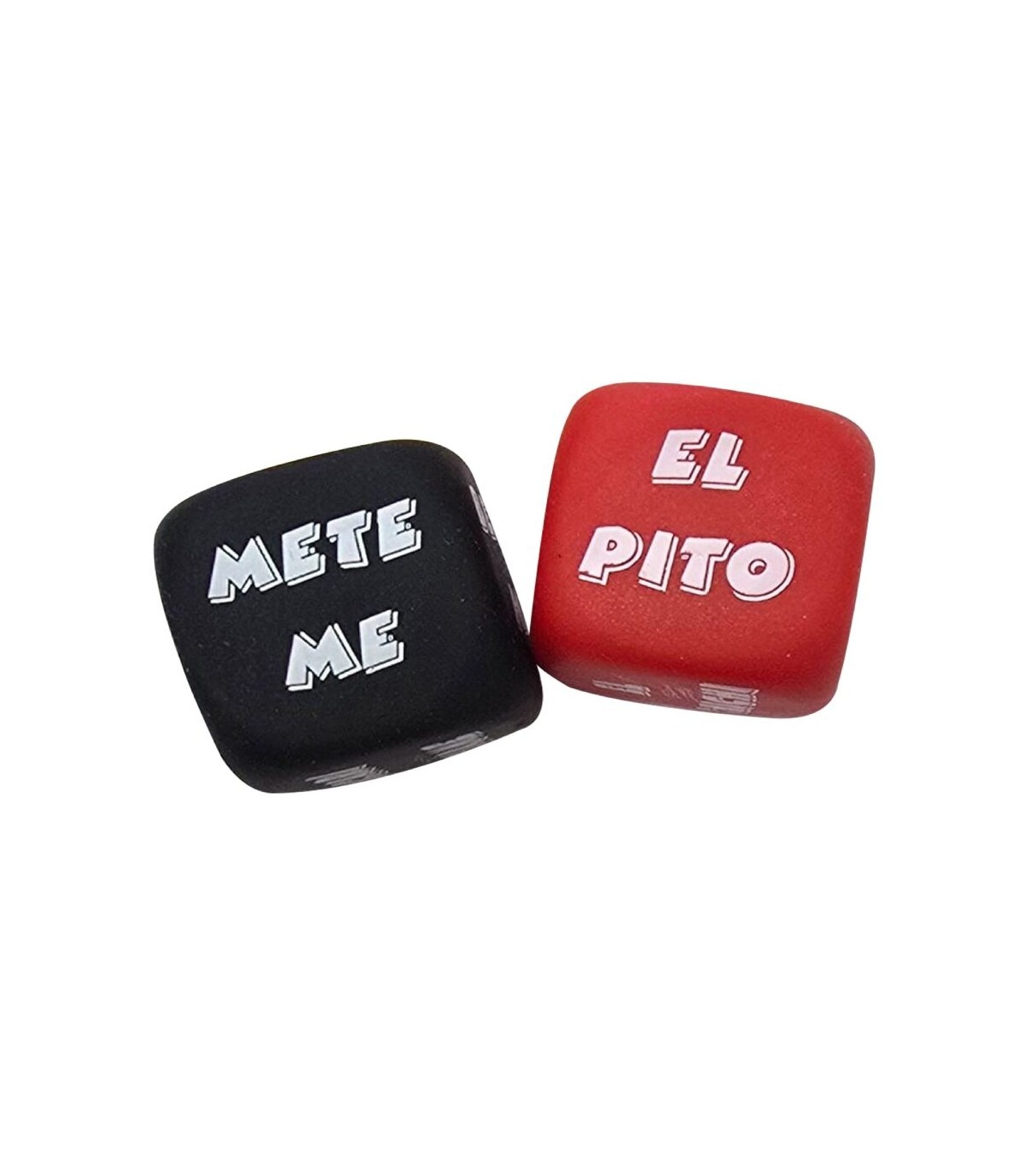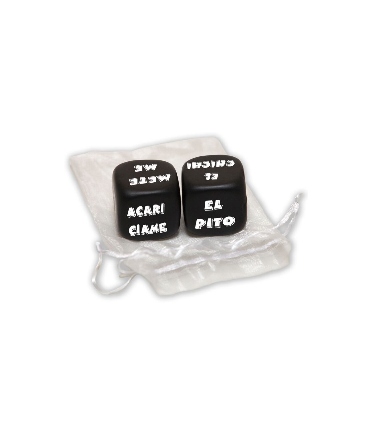 SET DE 2 DADOS DE COLOR NEGRO DE GRAN CALIDAD DE 25 mm de ACCION Y PARTE DEL CUERPO que van en una bolsita de seda transparente. Estos dados te dirán la acción que debes hacer en la parte del cuerpo de tu chico o chica.
