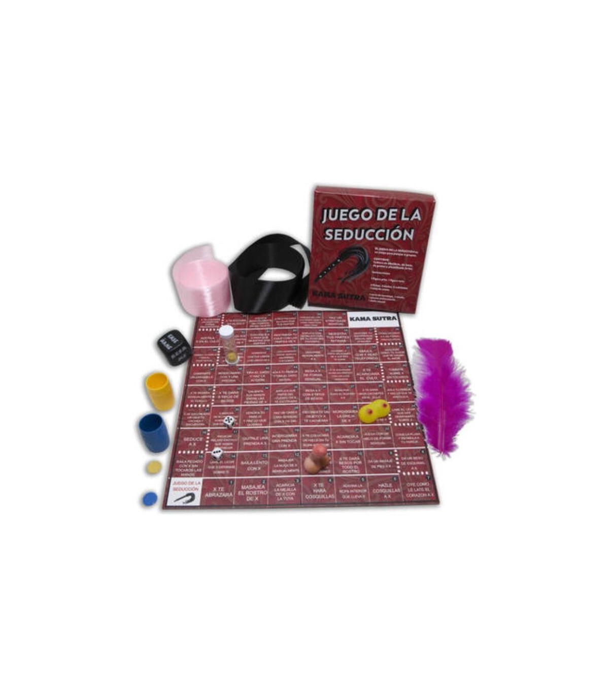 CONTIENE: INSTRUCIONES, CINTA DE BONDAGE, VENDA PARA LOS OJOS, PLUMA ESTIMULANTE, UN DADO DE GRAN CALIDAD DE 25 mm, RELOJ DE ARENA, UNA FIGURA PITO Y FIGURA TETA, 2 FICHAS, 2 CUBILETES, 2 DADOS NUMERICOS Y UN TABLERO PLASTIFICADO.