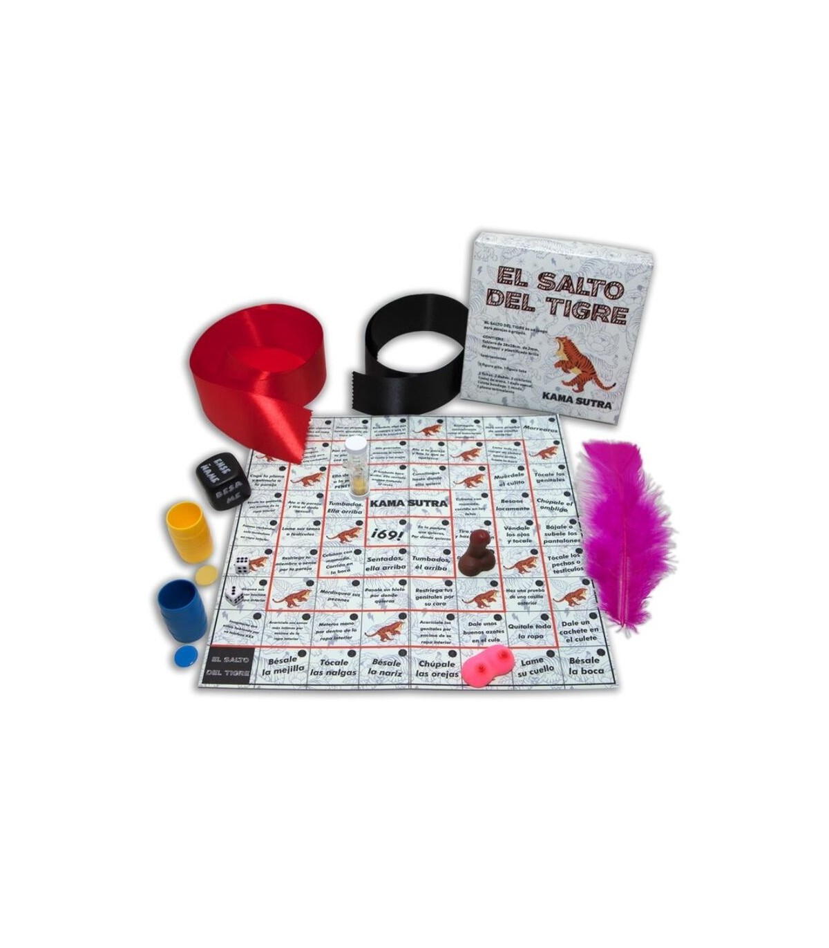 CONTIENE: INSTRUCIONES, CINTA DE BONDAGE, VENDA PARA LOS OJOS, PLUMA ESTIMULANTE, UN DADO DE GRAN CALIDAD DE 25 mm, RELOJ DE ARENA, 1 FIGURA PITO Y FIGURA TETA, 2 FICHAS, 2 CUBILETES, 2 DADOS NUMERICOS Y UN TABLERO PLASTIFICADO A TODO COLOR.