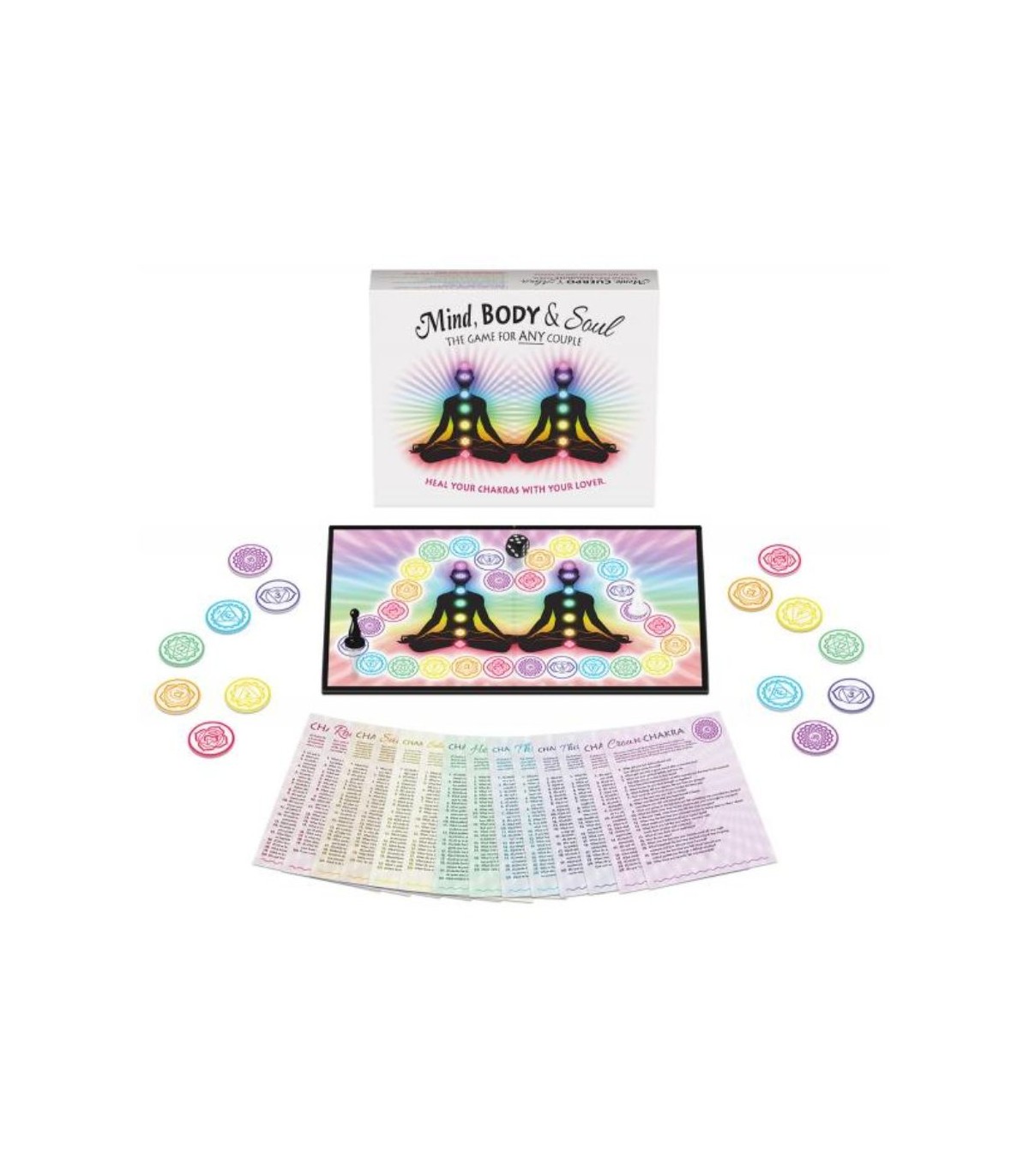 A medida que se avanza en el tablero de juego, usted y su pareja se hacen preguntas diseñadas para abrir sus chakras. Hay 20 preguntas por carta y dos conjuntos de cartas por los siete chakras para totalizar 240 preguntas de curación de chakras.