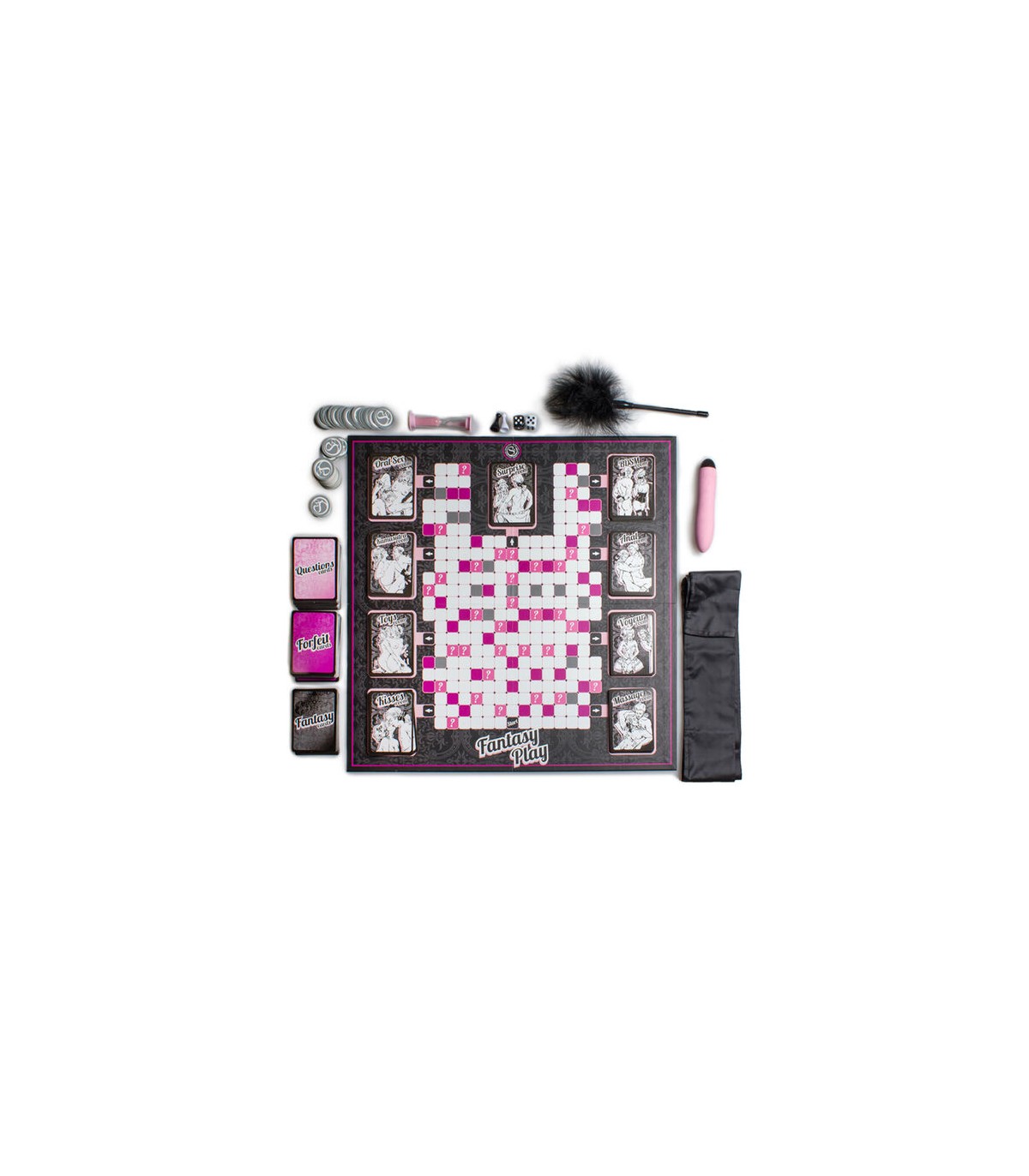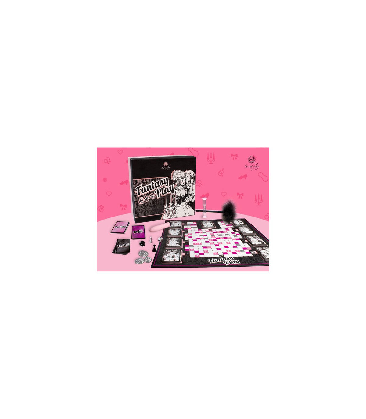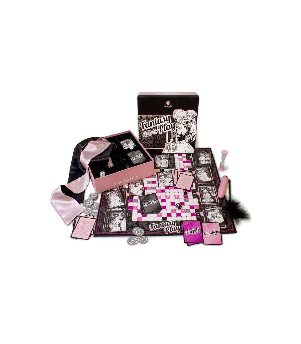 ppDESCUBRE LA FANTASIA EROTICA DE TU PAREJA DE LA MANERA MAS EXCITANTE ppTu pareja y tu viajareis en el tiempo para encontraros en el siglo XVIII siendo un par de ardientes amantes que se esconden para desatar toda su lujuria y pasion por las habitaciones de un gran palacio Rococo ppSe barajan cada uno de los grupos de tarjetas y se colocan en su sitio correspondiente en el tablero a excepcion de las tarjetas Questions preguntas Forfeit cards tarjetas de pruebas y los creditos que se colocaran al lado del tablero en zona neutral entre ambos jugadores ppCada uno de los jugadores coge una tarjeta negra Fantasy y escribe en ella la fantasia que le gustaria llevar a cabo Despues debe esconderla en cualquiera de las nueve habitaciones tematicas del tablero entre el resto de las tarjetas sin que el otro miembro de la pareja vea donde Puede ser una fantasia que se lleve a cabo cuando se finalice el juego o bien una que se realice otro dia ppLos jugadores escogen la dinamica del juego Pueden jugar alrededor del tablero respondiendo a preguntas o realizando pruebas durante el tiempo que deseen o pueden ir entrando en las distintas habitaciones y realizar las pruebas correspondientes hasta encontrar la tarjeta Fantasia que ha escondido la pareja ppLas tarjetas utilizadas se iran dejando de nuevo en su monton correspondiente debajo de todas ppEn las tarjetas donde aparezca XXX se debe utilizar el reloj de arena 60 segundos para cronometrar la prueba indicada Una vez este todo listo se dara la vuelta al reloj y se empezara la prueba Los creditos monedas con el simbolo de Secret Play se obtienen respondiendo correctamente a las preguntas de las tarjetas Questions y mediante la superacion de algunas de las pruebas de las tarjetas Forfeit cards Cuidado Tambien se pueden perder creditos en algunas de las pruebas ppEstas monedas pueden canjearse en cualquier momento por una prenda del otro jugador teniendo en cuenta que cada prenda cuesta dos creditos A las distintas habitaciones del palacio se entra a traves de la casilla correspondiente senalizada con una flecha blanca sobre fondo negro De esta forma si en el dado ha salido por ejemplo 4 contaremos 2 casillas la numero 3 sera la de la flecha con fondo negro y el numero 4 la habitacion donde se queria entrar Se accede a las habitaciones con puntuacion exacta Si un jugador quiere repetir en una habitacion que acaba de visitar debe salir y volver a entrar de nuevo El jugador que primero consiga encontrar la tarjeta Fantasy de su pareja dentro de una de las habitaciones sera el ganador Obtendra como premio el placer de satisfacer la fantasia oculta de su pareja ppComienzo del juego Ambos jugadores lanzan su dado y el que obtenga el numero mas alto comienza empezando desde la casilla de salida Start En caso de empate comenzara el primero que se quite una prenda de ropa El jugador que inicie la partida avanzara tantas casillas como el dado indique Puede ir en cualquier direccion arriba abajo derecha izquierda o en diagonal Debera realizar lo que le indique el color de la casilla donde caiga y a continuacion sera el turno del segundo jugador ppSIGNIFICADO DE LAS CASILLAS pulliCOLOR BLANCO El jugador que cae en una de estas casillas descansa y pasa el turno al otro jugador liliCOLOR VIOLETA El jugador que cae en esta casilla debe coger la primera tarjeta del monton Forfeit cards y realizar lo que en ella se indique Puedes ganar o perder creditos liliCOLOR ROSA FUCSIA El jugador que cae en esta casilla debe coger la primera tarjeta del monton Questions El otro jugador es quien debera leer la tarjeta Si contesta la pregunta correctamente obtendra un credito liliCOLOR GRIS Estas casillas son el Bar y el jugador que caiga en ellas puede pedir una consumicion a cambio de dos creditos que devolvera al monton correspondientepSIGNIFICADO DE LAS HABITACIONES pulliMASSAGE Habitacion de masajes Los jugadores descubriran los placeres de una buena relajacion del cuerpo asi como sitios y zonas erogenas por explorar liliORAL SEX Habitacion del sexo oral Se trata de utilizar bien la boca y los labios en las zonas del cuerpo impensables TOYS Habitacion de los juguetes Es hora de usar algun que otro complemento extra para maximizar vuestro placer liliBDSM Habitacion del BDSM Es una sutil toma de contacto con el desconocido mundo del placer obtenido a traves del dolor KISSES Habitacion de los besos Busca la excitacion a traves del beso en zonas inimaginables liliKAMASUTRA Habitacion de las posturas Los jugadores pondran en practica posturas algunas de ellas quiza desconocidas hasta el momento Todas ellas aplicables a cualquier tipo de pareja liliANAL Habitacion del sexo anal Se trata de buscar el placer a traves de la estimulacion anal liliVOYEUR Habitacion del voyerismo Los jugadores encontraran placer con el sentido de la vista viendo a su pareja en situaciones de lo mas picante SURPRISE Habitacion sorpresa Contiene un compendio de pruebas pertenecientes a todas las habitacionespEl juego contiene pulli1 Tablero lili2 Fichas lili2 Dados lili15 Tarjetas habitacion masajes lili15 Tarjetas habitacion oral lili15 tarjetas habitacion juguetes lili15 Tarjetas habitacion BDSM lili15 Tarjetas habitacion besos lili15 Tarjetas habitacion posturas lili15 Tarjetas habitacion anal lili15 Tarjetas habitacion voyeur lili15 Tarjetas habitacion sorpresa lili80 Tarjetas Forfeit lili80 Tarjetas Questions lili18 Tarjetas Fantasy lili80 Fichas de credito lili1 Cinta de raso lili1 Pluma lili1 Reloj de arena lili1 VibradorpSe sugiere tener pulliBebida fria liliCubitos de hielo liliPintalabios liliBoligrafo liliAceite de masaje liliLubricante liliNata u otro alimento comestible liliGanas de disfrutar y fantasear p